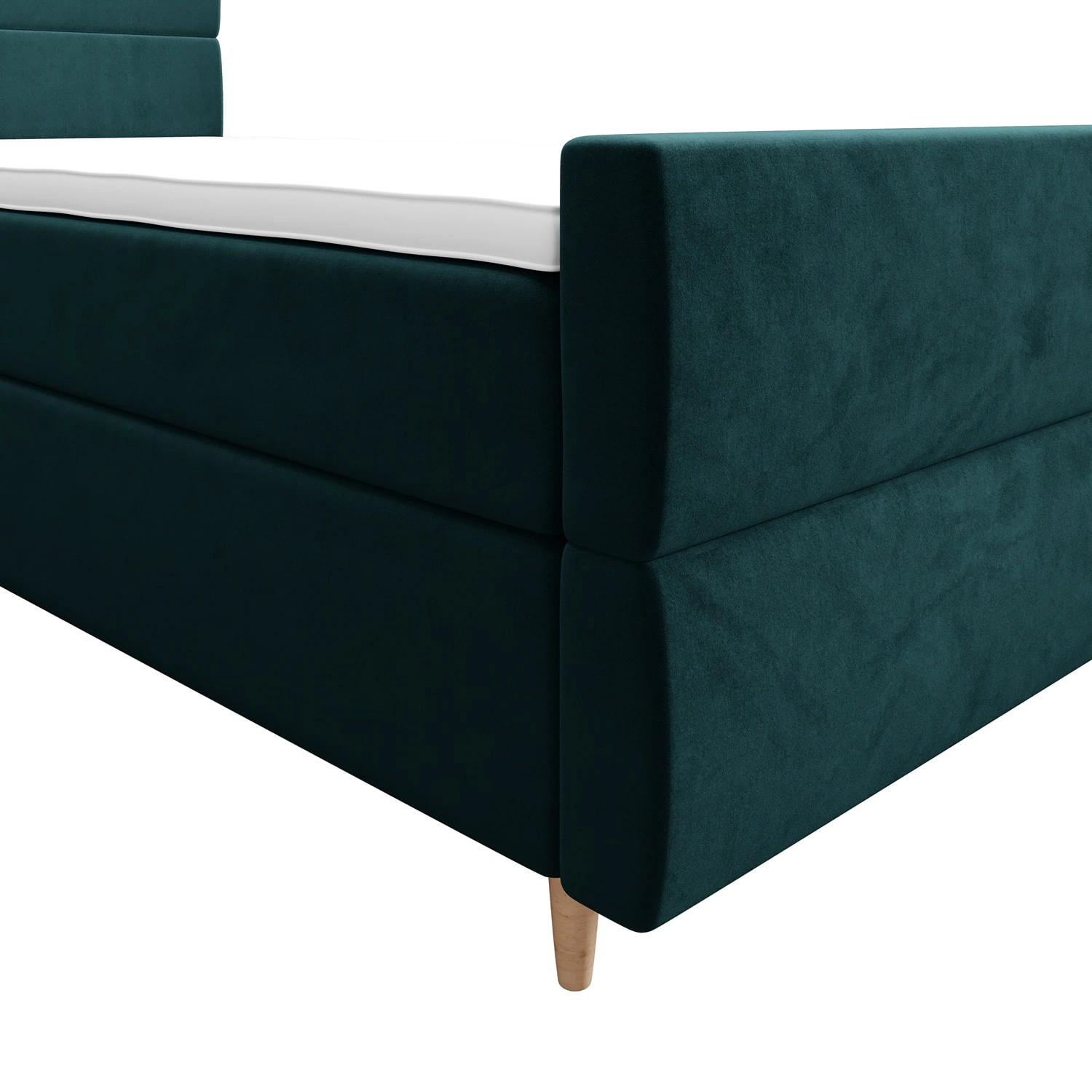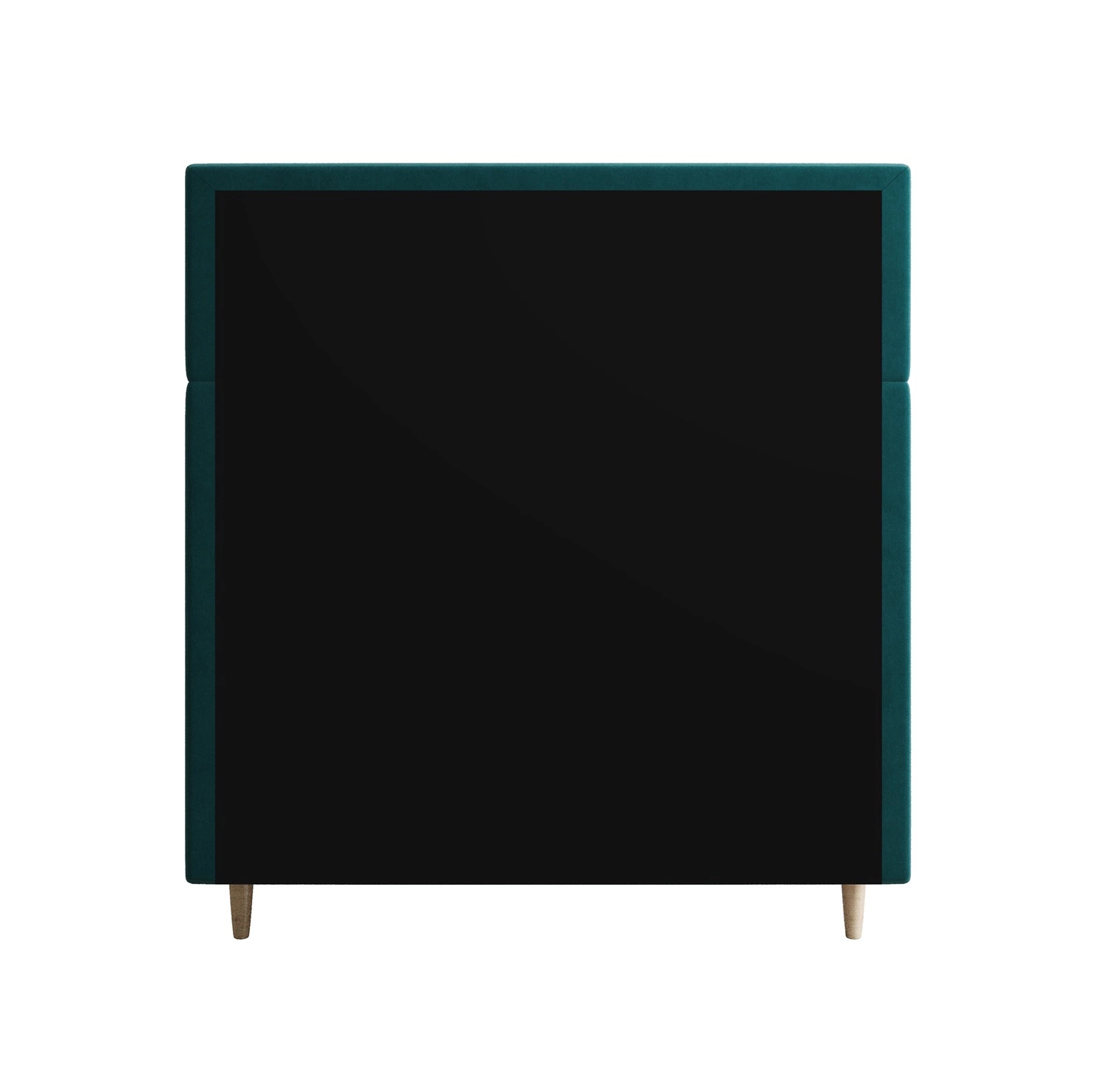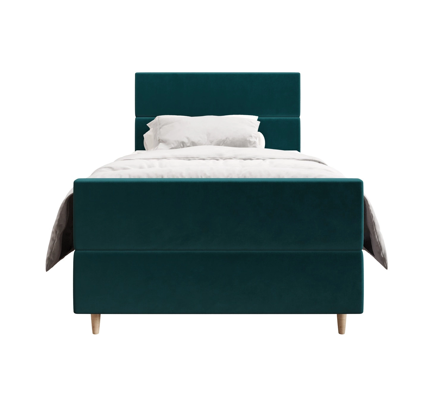 Kontinentální postel Benet 120x200 tyrkysová v moderním skandinávském stylu s čalouněným čelem a nohou postele s úložným boxem