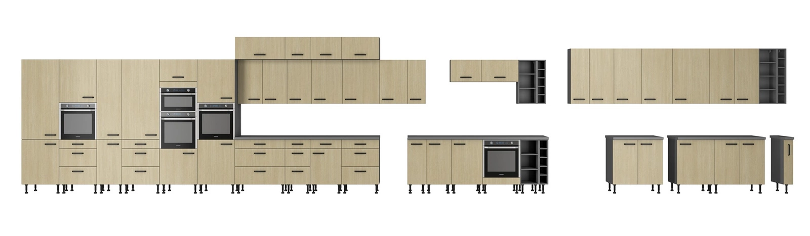 Dvě police lze vysunout a vytvořit tak prostor pro vysoké předměty. Standardní vybavení kuchyňské linky zahrnuje závěsy se systémem pozvolného zavírání. Retardéry zvyšují komfort i zabezpečení použití nábytku.