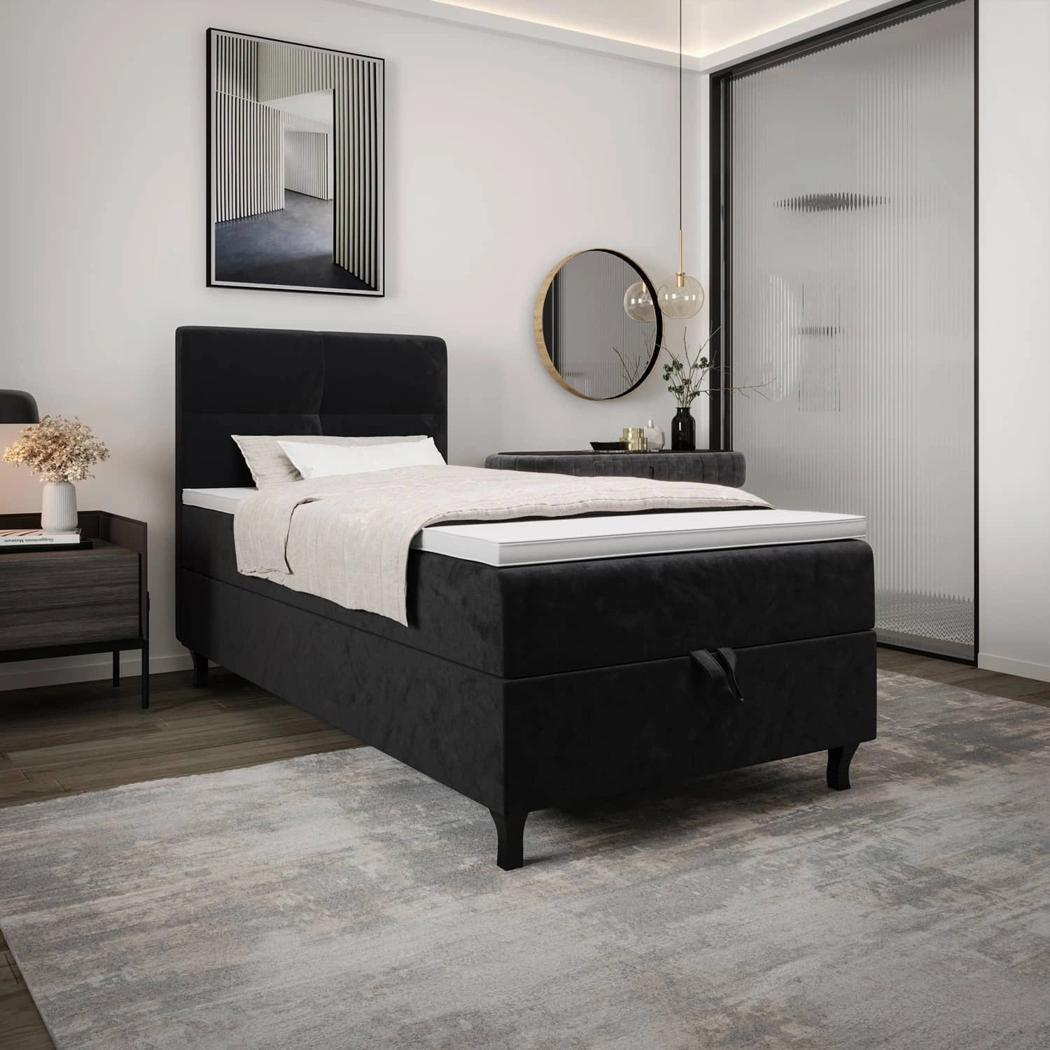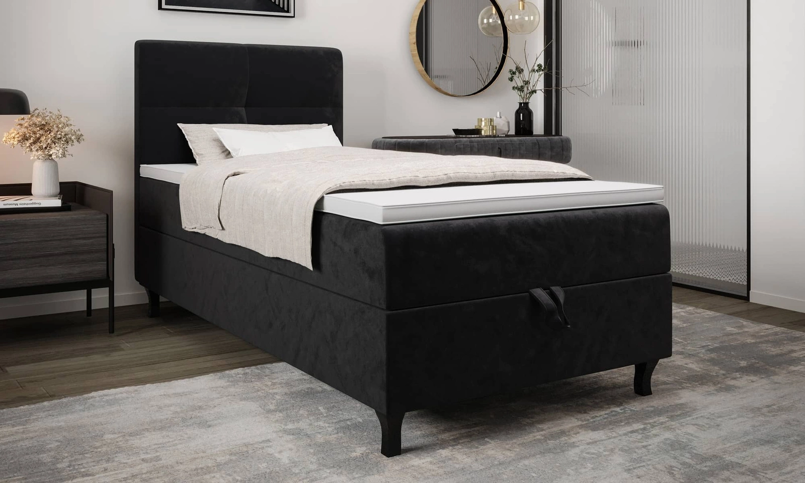 Kontinentální postel Melba 120x200 grafit v moderním skandinávském stylu s čalouněným čelem postel s úložným boxem