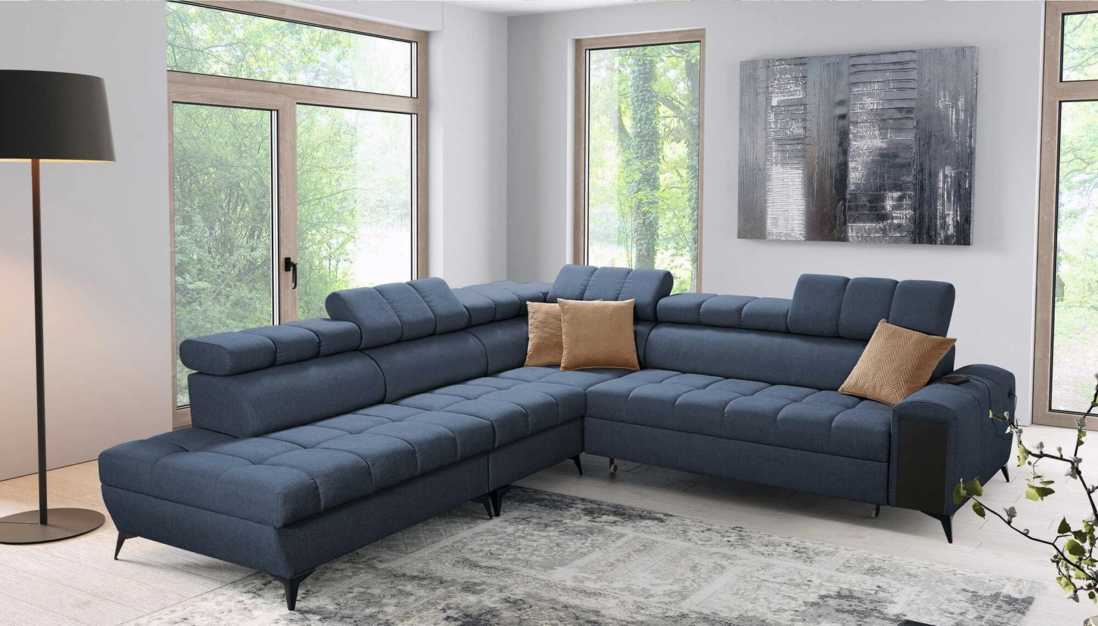 Rohová sedačka s funkcí spaní Bolmso IX modrá levá komfortní rohová sedačka do obývacího pokoje se zásuvkovými kontejnery na lůžkoviny stylový design