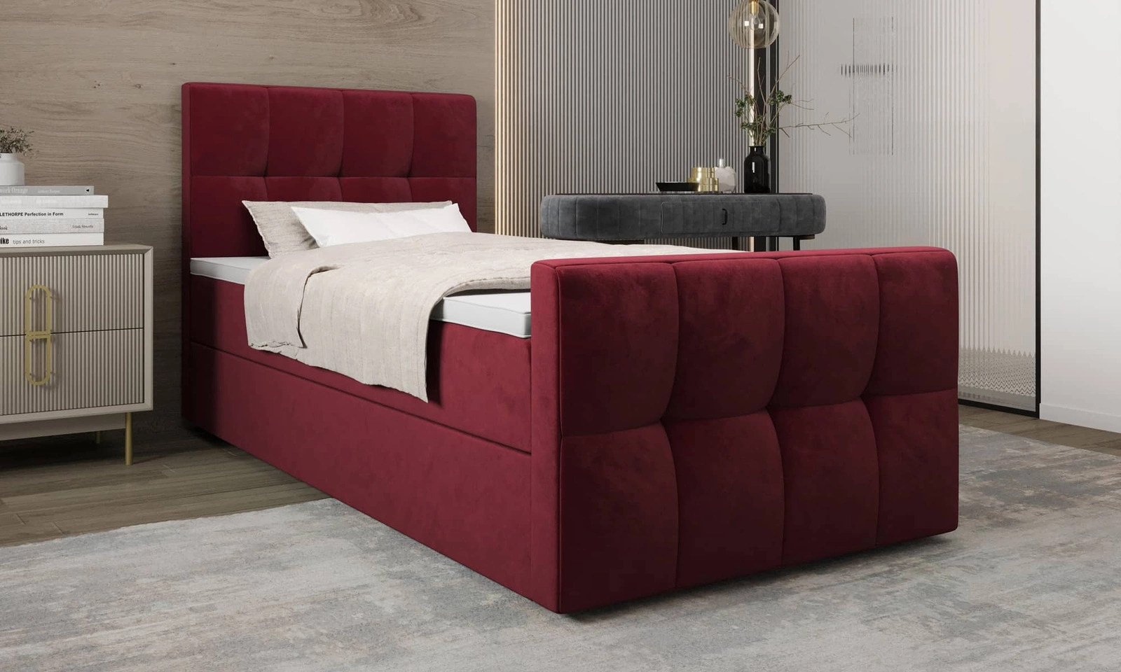 Vínová kontinentální postel Manhattan 90x200 v moderním skandinávském stylu s čalouněným čelem a nohou postele s úložným boxem