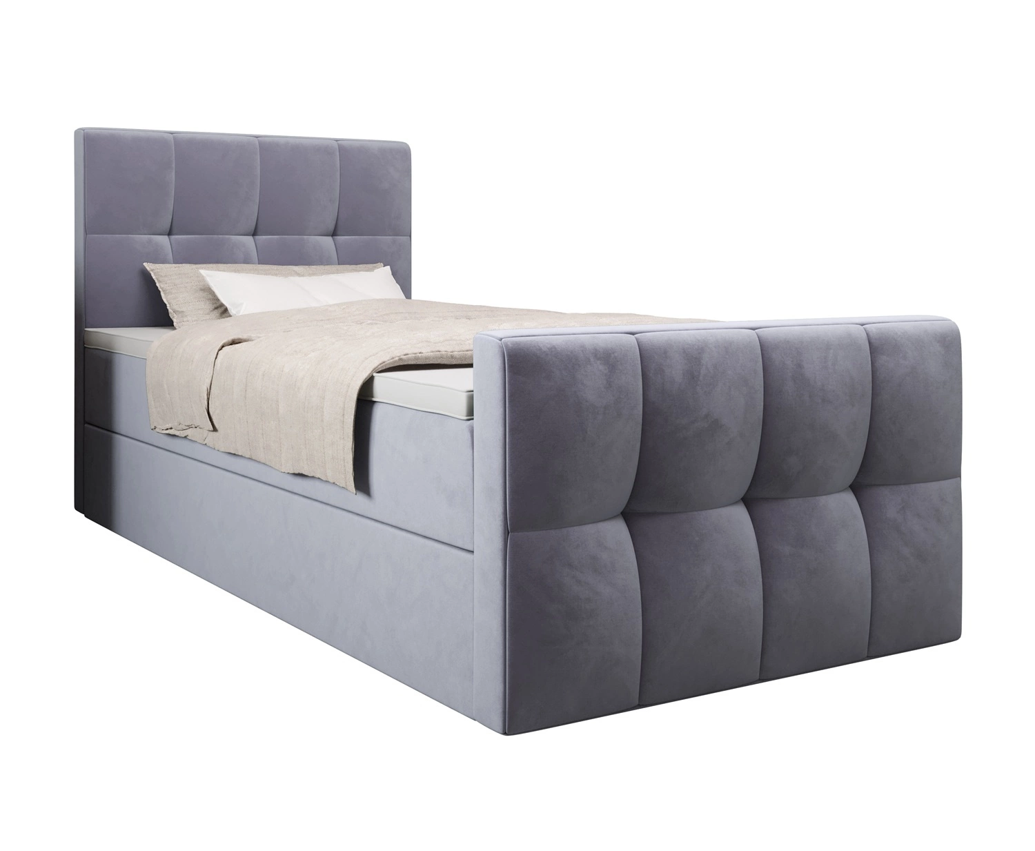 Modrá kontinentální postel Manhattan 90x200 v moderním skandinávském stylu s čalouněným čelem a nohou postele s úložným boxem