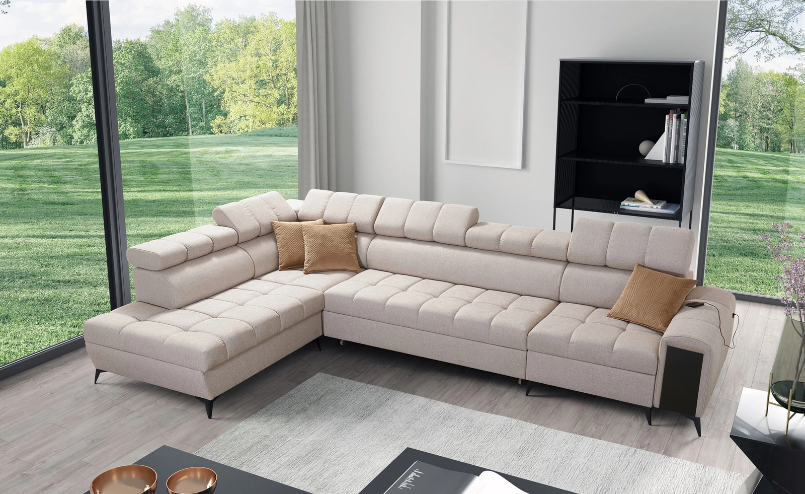 Rohová pohovka s funkcí spaní Bolmso XI béžová levá strana stylový design rohová rozkládací pohovka se zásuvkou a kontejnery na lůžkoviny
