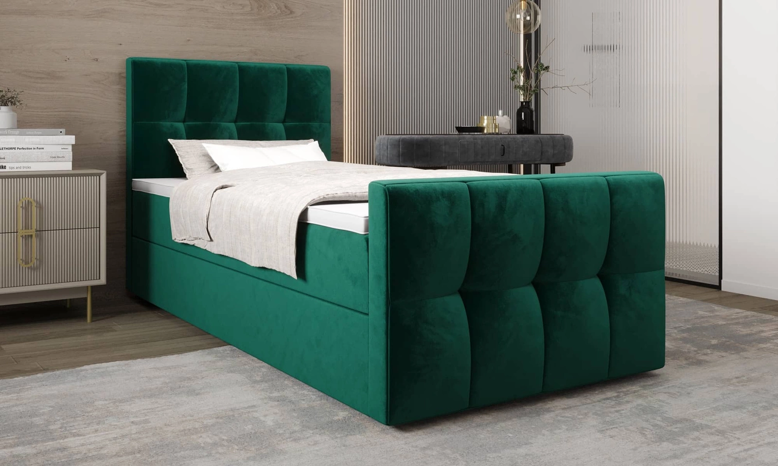 Kontinentální postel Manhattan 100x200 v lahvově zelené barvě je ideální volbou do každé ložnice nebo pokoje pro mladé.