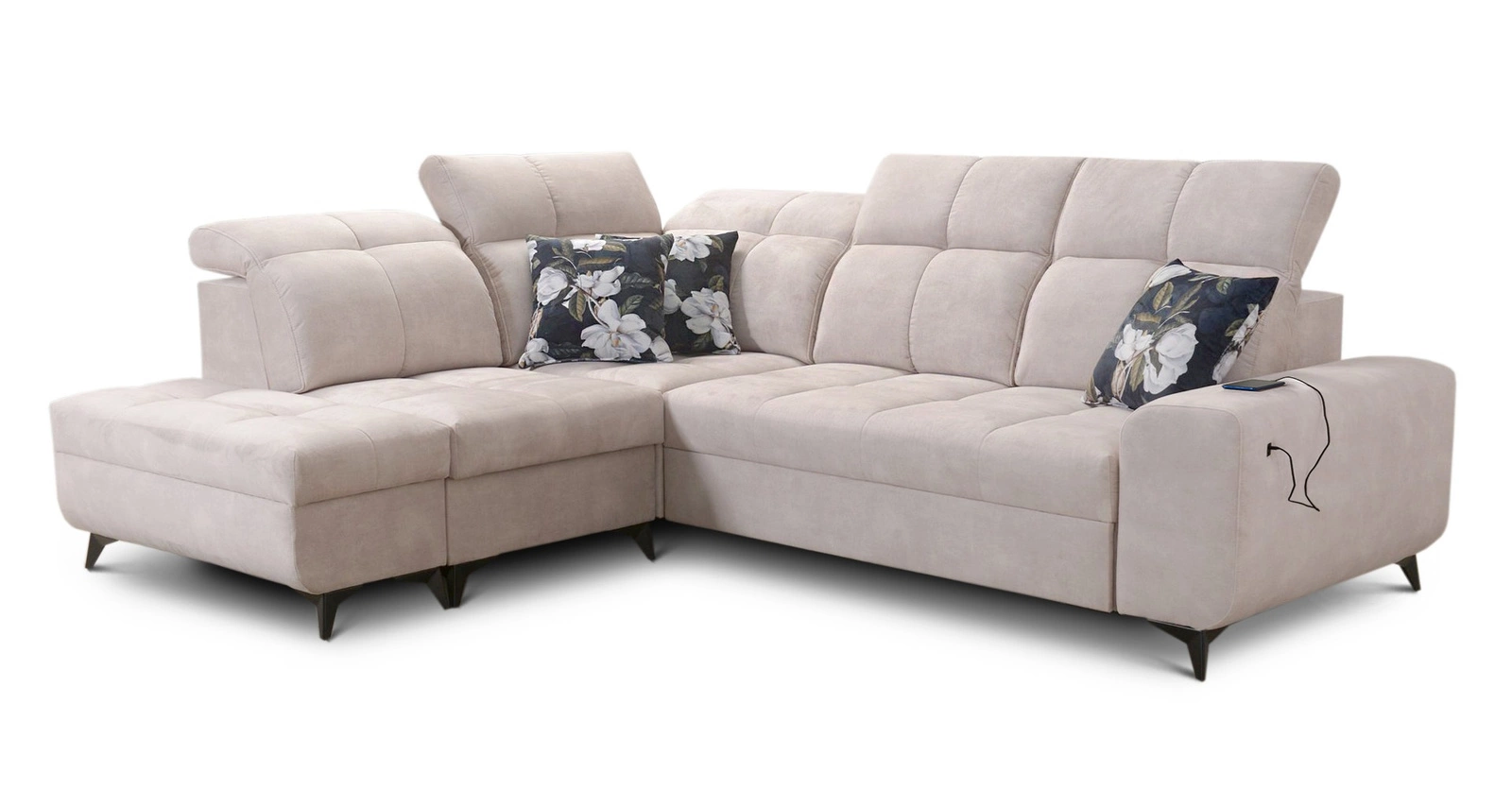Mezi doplňky tohoto nábytku, které ocení všichni uživatelé, patří dva kontejnery na lůžkoviny, nastavitelné opěrky hlavy a nabíjecí zásuvka USB na boku rohové skříně.