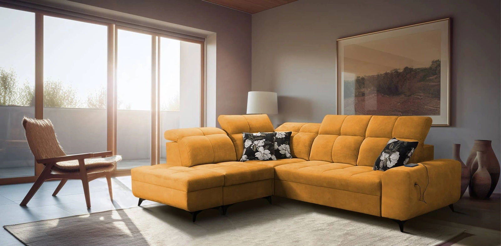 Rohová pohovka Buffalo VII ve žluté barvě s nastavitelnými opěrkami hlavy je zajímavě vypadající kus nábytku s elegantním povrchem.