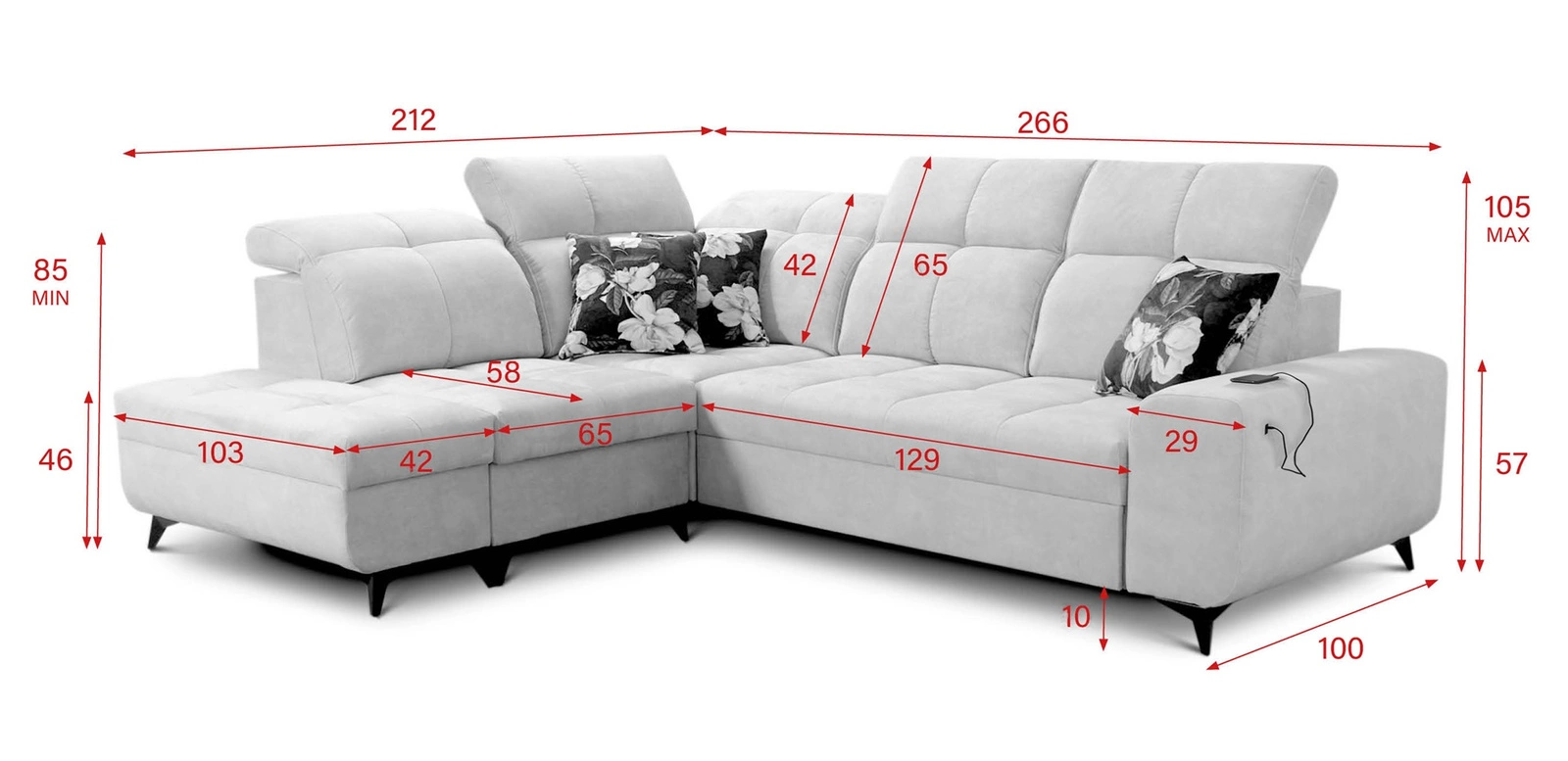 Rozměry nábytku umožňují vyplnění prostoru v prostorném obývacím pokoji nebo zasedací místnosti. Šířka rohu 266 cm, maximální výška 105 cm a hloubka 212 cm. Spací plocha rohové jednotky je 129x190 cm. Výška sedadla nábytku je 46 cm a maximální výška opěradla je 65 cm. Vlnité pružiny a polyuretanová pěna T30 je materiál, z něhož je vyrobeno sedadlo rohu. Pevné opěradlo s nastavitelnými opěrkami hlavy umožní snadné adaptace úhel opěrek hlavy podle vašich preferencí a zaručí vám pohodlný odpočinek po dlouhém dni, který oceníte vy, vaši blízcí i hosté, kteří si na tuto jedinečnou rohovou pohovku sednou.