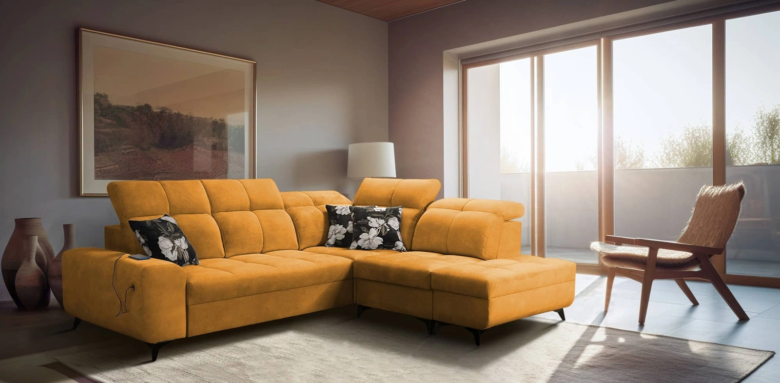 Rohová pohovka Buffalo VII ve žluté barvě s nastavitelnými opěrkami hlavy je zajímavě vypadající kus nábytku s elegantním povrchem.