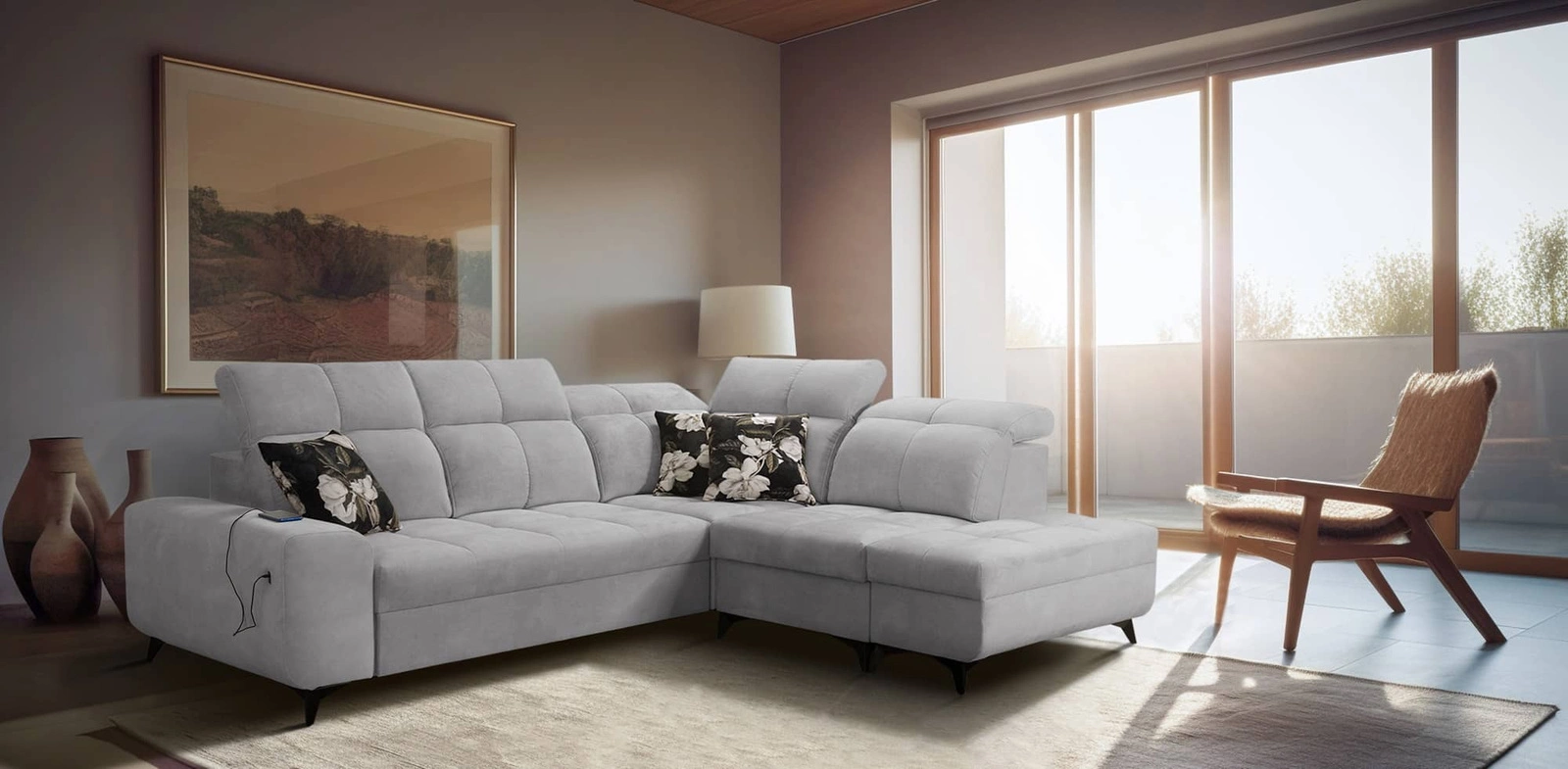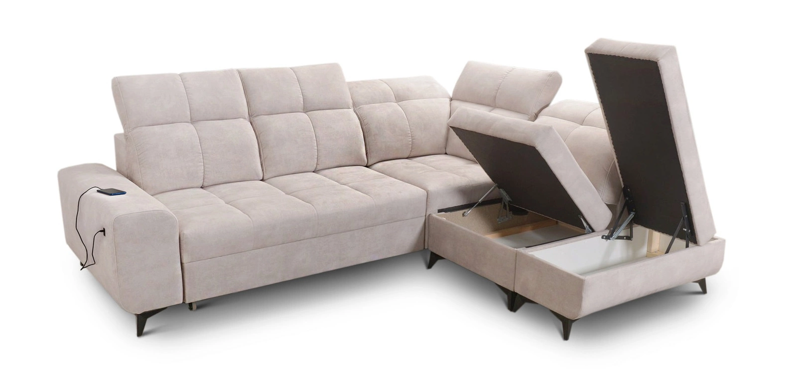 Mezi doplňky tohoto nábytku, které ocení všichni uživatelé, patří dva kontejnery na lůžkoviny, nastavitelné opěrky hlavy a nabíjecí zásuvka USB na boku rohové skříně.