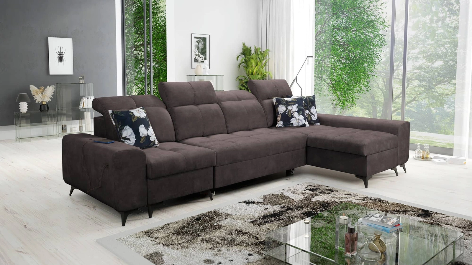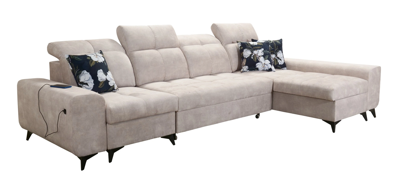 Mezi doplňky tohoto nábytku, které ocení všichni uživatelé, patří kontejner na lůžkoviny, nastavitelné opěrky hlavy a nabíjecí zásuvka USB v boční části rohové skříně.