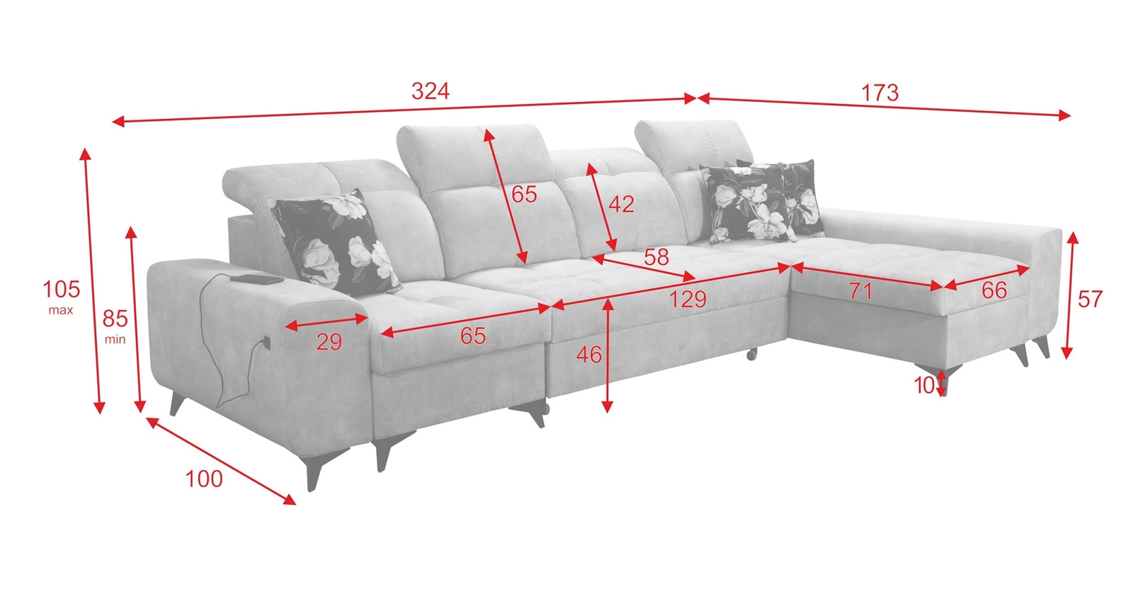 Rozměry nábytku umožňují vyplnění prostoru v prostorném obývacím pokoji nebo zasedací místnosti. Šířka rohu 324 cm, maximální výška 105 cm a hloubka 173 cm. Spací plocha rohové jednotky je 129x199 cm. Výška sedadla nábytku je 46 cm a maximální výška opěradla je 65 cm. Vlnité pružiny a polyuretanová pěna T30 je materiál, z něhož je vyrobeno sedadlo rohu. Pevné opěradlo s nastavitelnými opěrkami hlavy umožní snadné adaptace úhel opěrek hlavy podle vašich preferencí a zaručí vám pohodlný odpočinek po dlouhém dni, který oceníte vy, vaši blízcí i hosté, kteří se na tuto jedinečnou rohovou pohovku posadí.