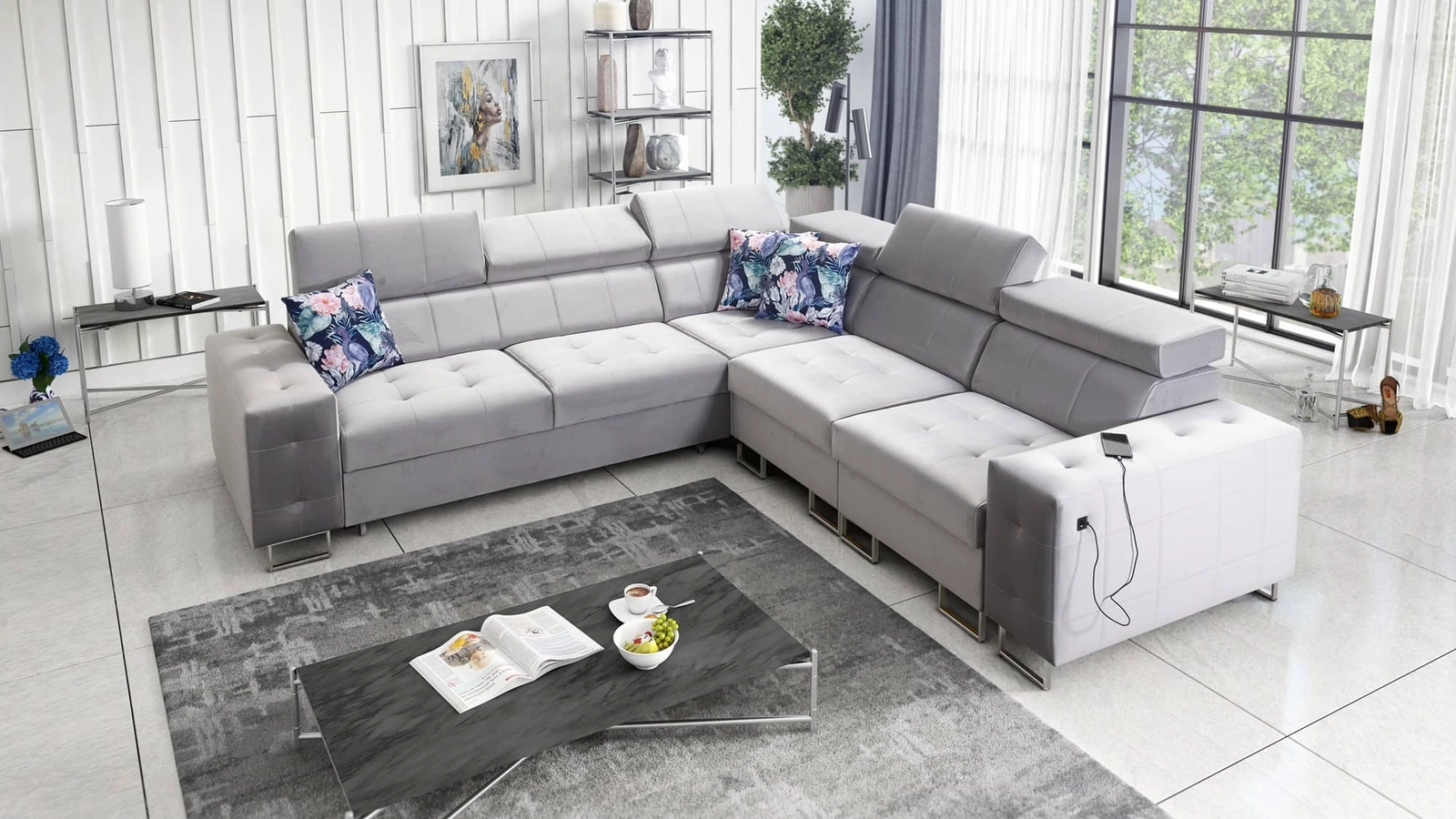 Podrobnosti o moderní rohové pohovce s funkcí spaní Hampton III