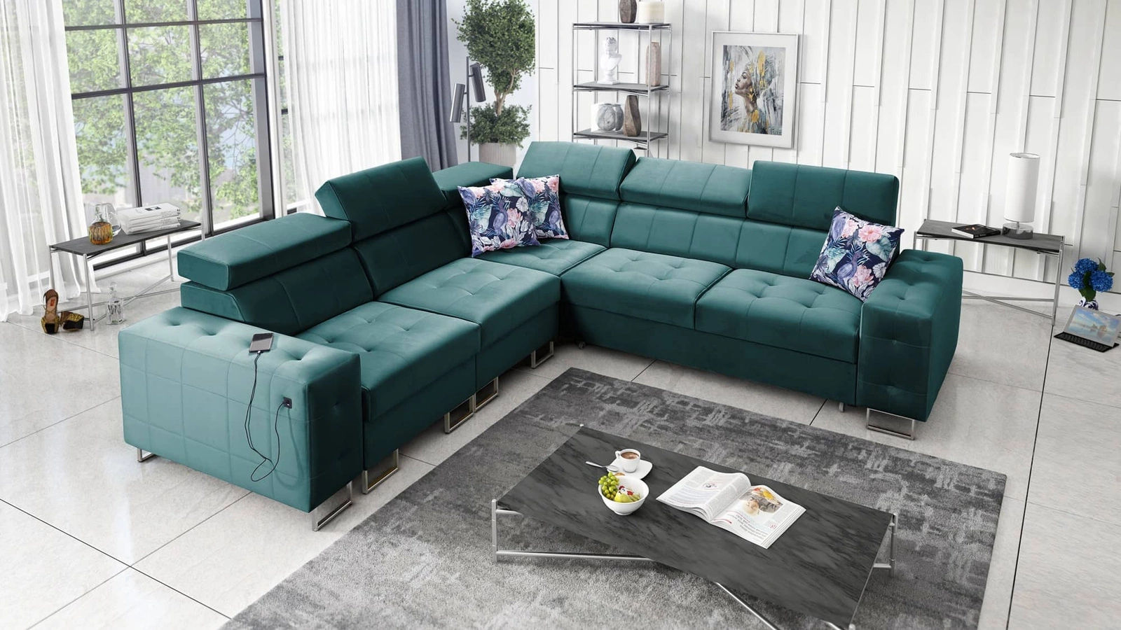 Rohová pohovka Hampton III v mořské barvě s nastavitelnými opěrkami hlavy je elegantním kusem nábytku, který dokonale zapadne do jakéhokoli uspořádání ve vaší domácnosti.