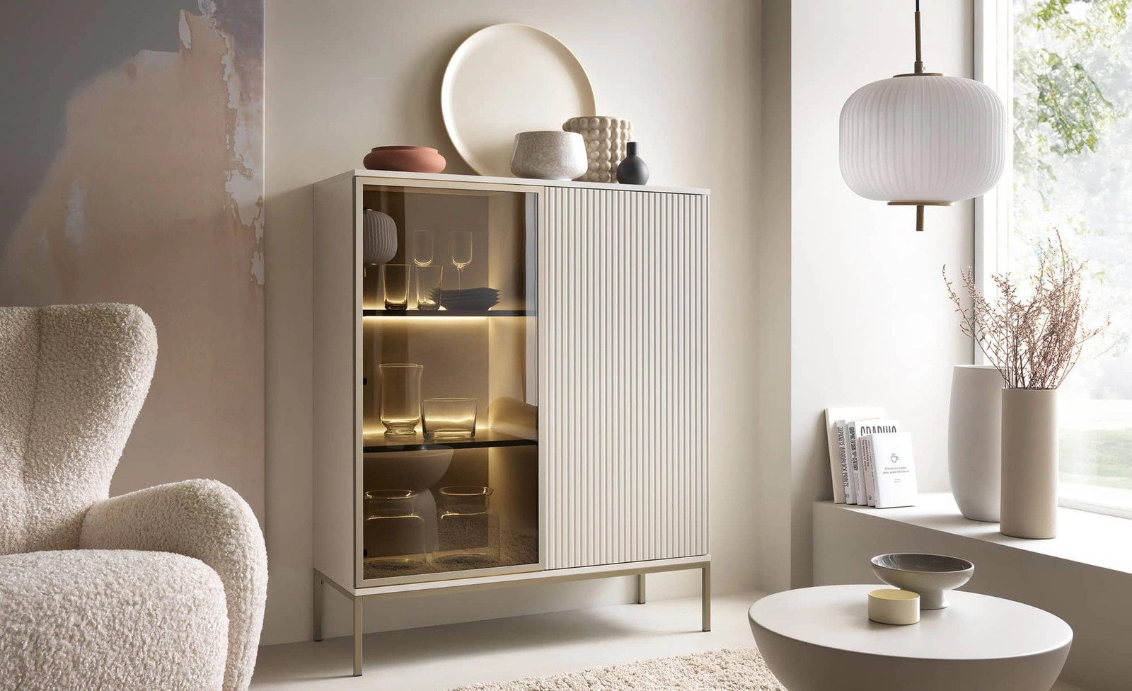 Webové stránky Amma je jedinečnou kombinací geometrických formuláře,jemné barvy a zajímavý design. Přítomnost komody se stane stylovou tečkou na závěr místnosti a dodá jí moderní a jedinečnou atmosféru. Módní juxtapozice drážkovaná čela v módním béžovém barevném provedení v kašmírovém odstínu vysílání originální a estetický vzhled vitríny. Prosklená přední část je poutavým prvkem, který vám umožní zvýraznění příslušenství pro výzdobu obývacího pokoje. Jedinečný design vitríny se osvědčí i v prostředí nejnáročnější interiér.