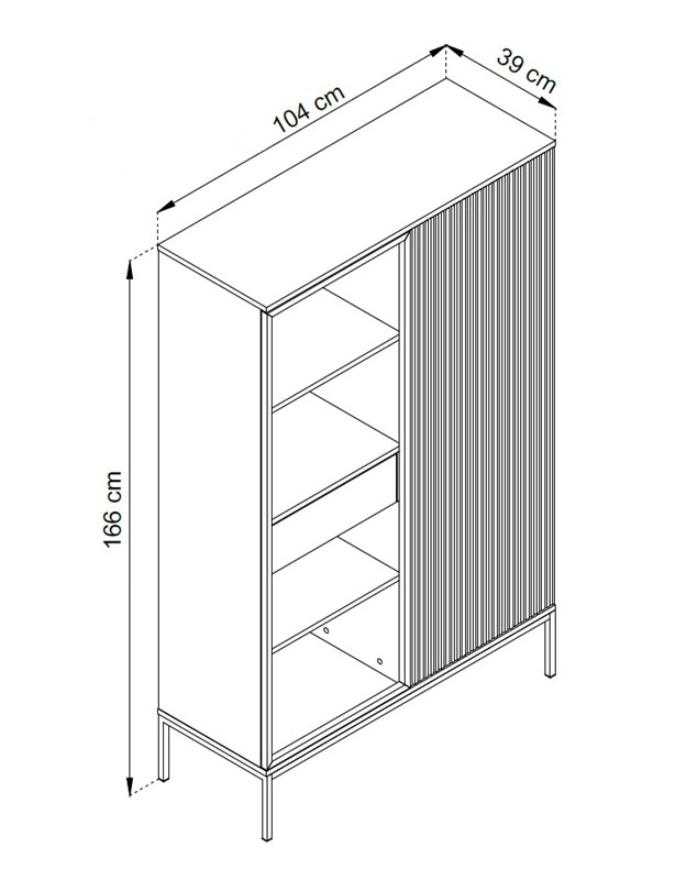 Drážkovaná čela jsou vyrobena z mDF o tloušťce 18 mm. Tělo vyrobené z vysoce kvalitní laminovaná deska, který je odolný vůči vnějším vlivům, jako jsou otlaky, nárazy a nešťastné škrábance. Prosklená přední část vitríny je vyrobena z tvrzené bezpečnostní sklo v tmavém odstínu. Vitrína je vybavena diskrétním osvětlení LED, dodává designu vizuální lehkost a funkčnost. Struktura nábytku byla vyztužena vkusnými prvky kovové nohy zlaté barvy.