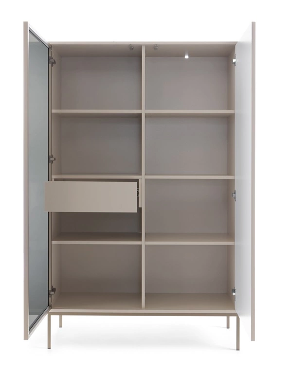 Webové stránky jsou vytvořeny z 2 dveře. Pro otevření dveří vitríny bylo použito následující bezúchytkový systém push-to-open. Použitý systém zvyšuje pohodlí a bezpečnost nábytku. Webové stránky jsou rozděleny na do osmi sekcí s policemi. Uvnitř skříně se nachází také zásuvka se systémem plného výsuvu. Moderní vitríny do obývacího pokoje záruka bezproblémové používání a trvanlivost celého nábytku po mnoho let používání. Módní kombinace béžové barvy v kašmírovém odstínu se zlatým základem se dobře mísí s ostatními barvami, takže se barva skleněné vitríny z kolekce Amma jsou ideální jako vitrína do obývacího pokoje, vitrína do jídelny nebo vitrína do pokoje knihy.