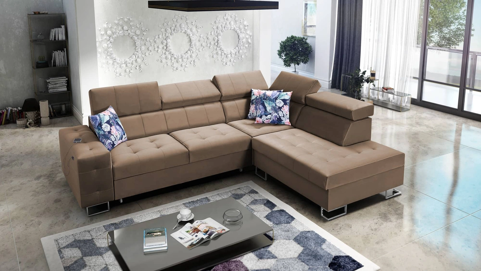Rohová pohovka Hampton VII ve světle hnědé barvě s nastavitelnými opěrkami hlavy je elegantním kusem nábytku, který dokonale zapadne do jakéhokoli uspořádání ve vaší domácnosti.