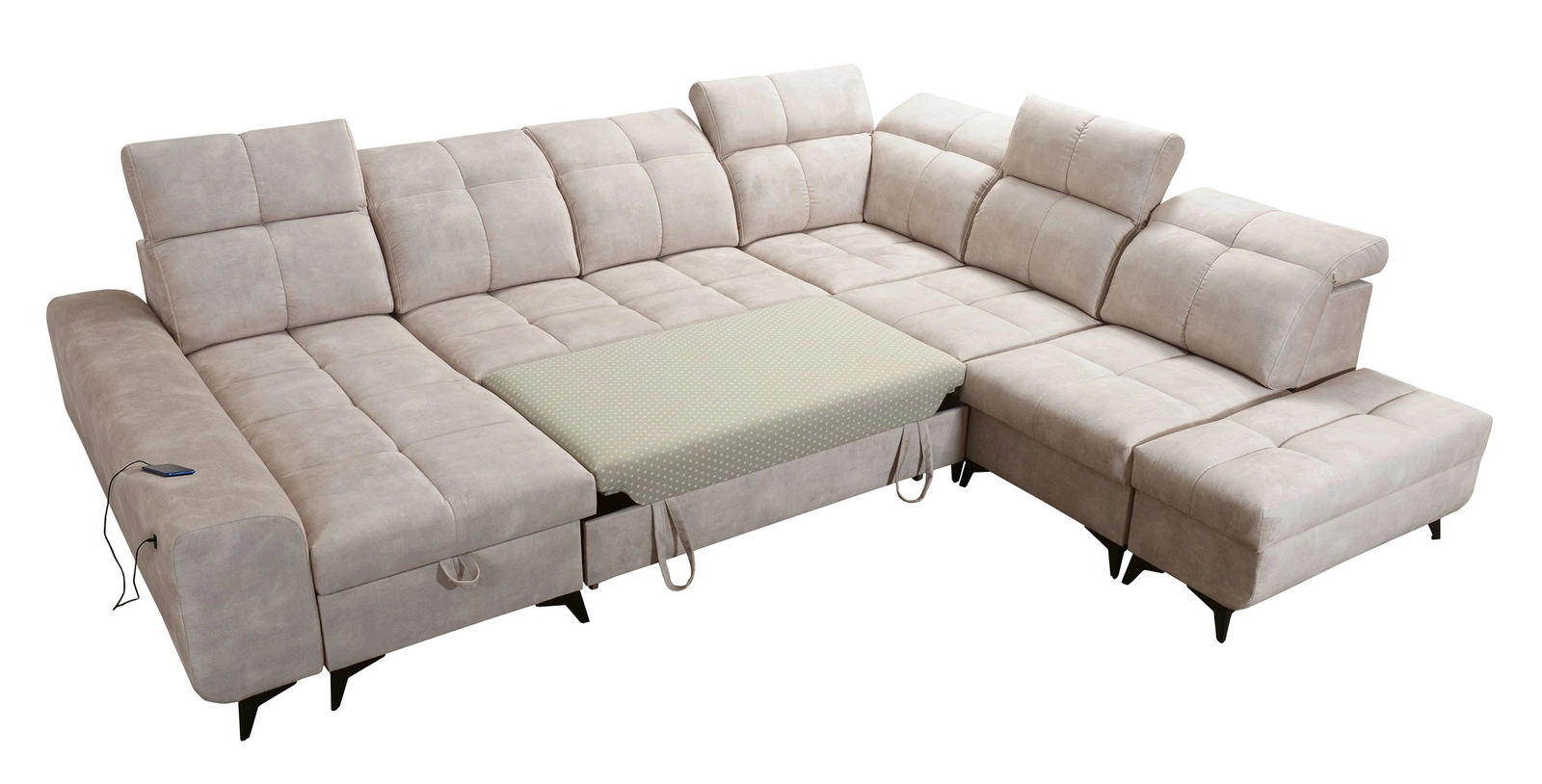 Mezi doplňky tohoto nábytku, které ocení všichni uživatelé, patří až sedm nastavitelných opěrek hlavy, čtyři nádoby na lůžkoviny a nabíjecí zásuvka USB v boční části rohové skříně.