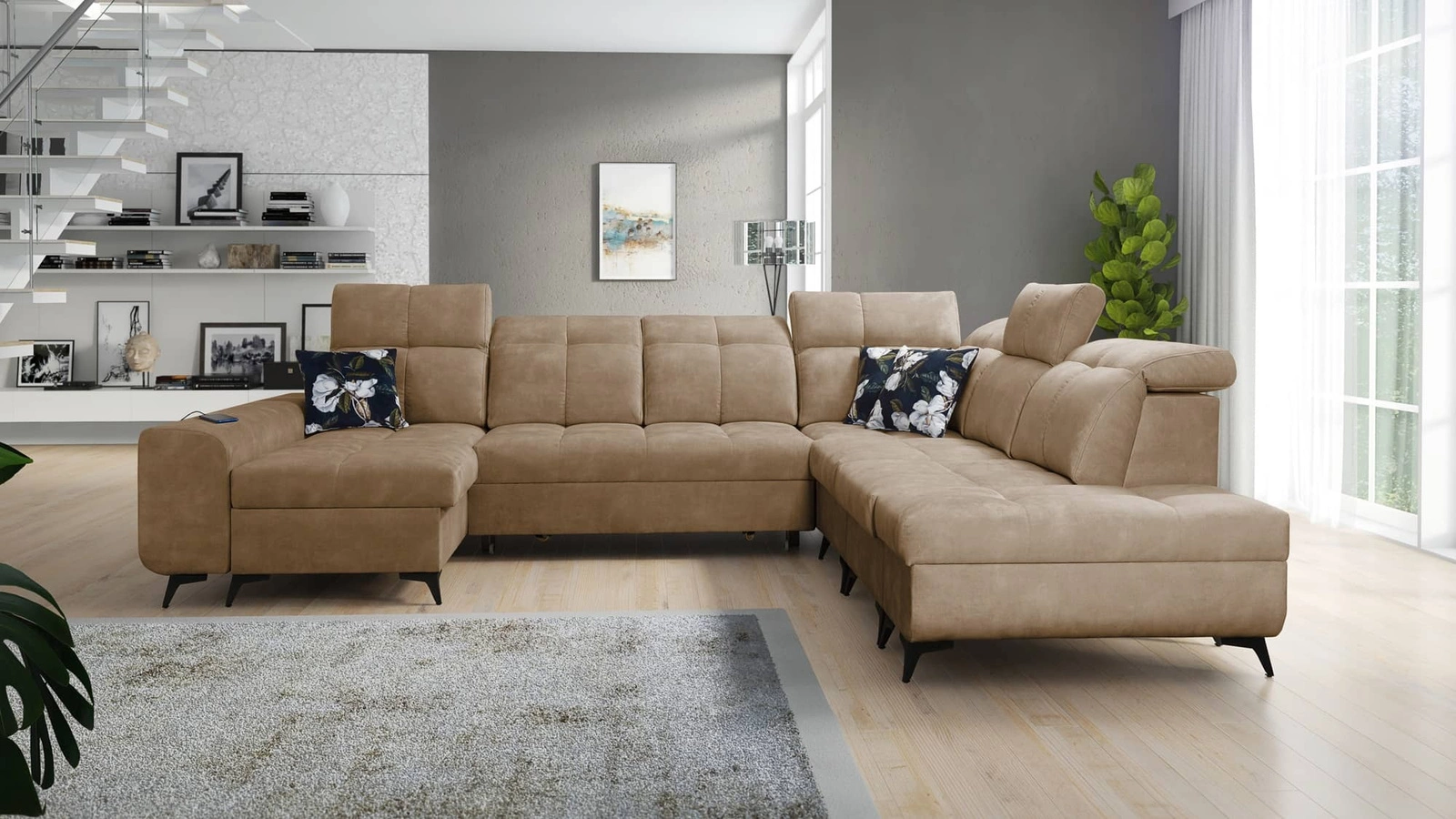 Rohová sedací souprava s funkcí spaní Buffalo X tmavě béžová levá funkční a pohodlná rohová sedací souprava do pokoje s kontejnery na lůžkoviny