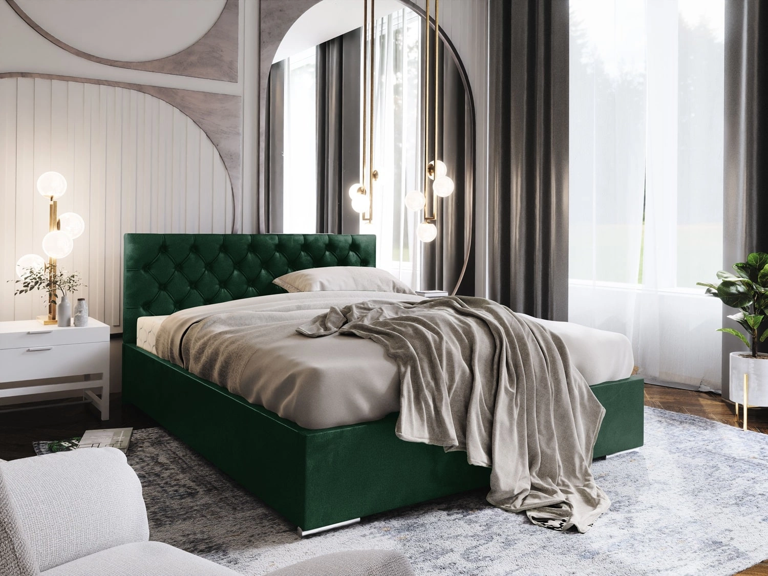 Čalouněná postel Alvorada 140x200 lahvově zelená s kontejnerem v moderním skandinávském stylu s prošívaným čelem