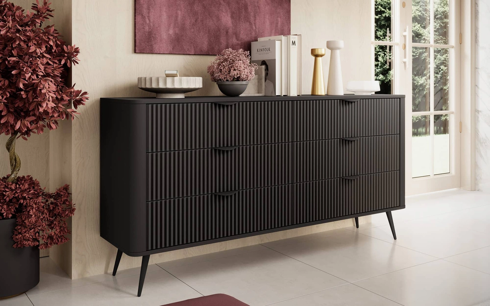 Komoda Lante o délce 163 cm v černé barvě je moderní kus nábytku, který překvapí svým tvarem a estetikou.