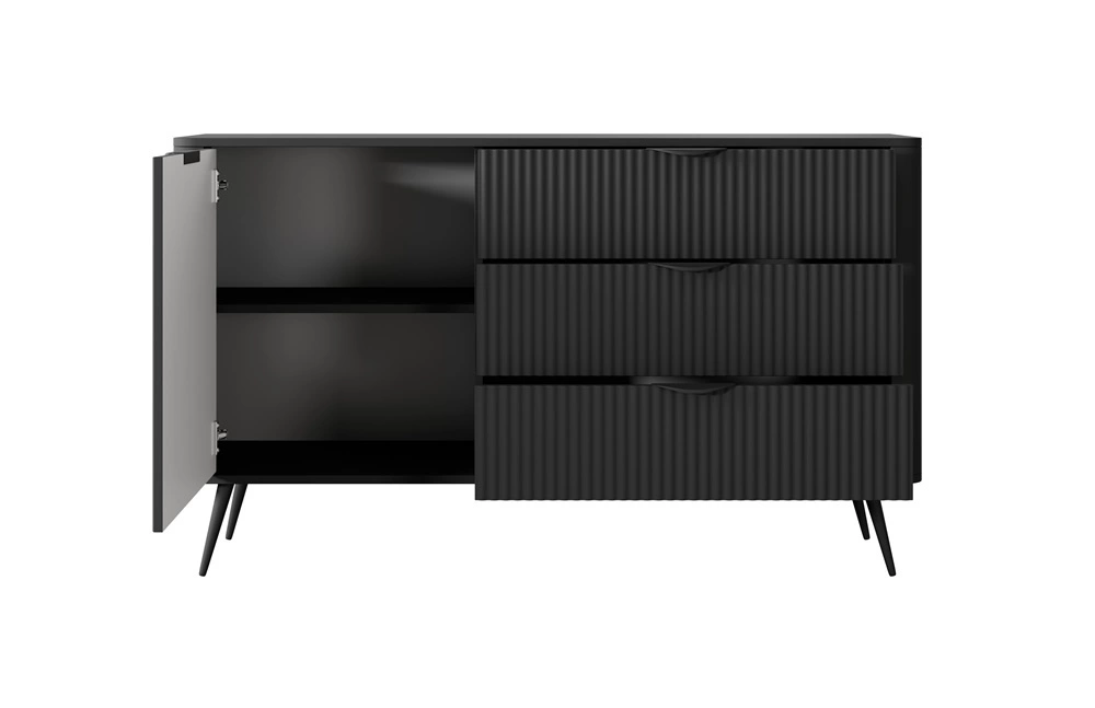 Drážkovaná čela byly vyrobeny z mDF. Tělo komody je vyrobeno z materiálu vysoce kvalitní laminovaná deska o tloušťce 16 mm, který je odolný vůči vnějším vlivům, jako jsou otlaky, nárazy a nešťastné škrábance. Struktura nábytku se měnila pomocí černým kovové nohy. Precizní zpracování a pozornost věnovaná detailům zajistí, že si komoda zachová svůj krásný vzhled po mnoho let, aniž by ztratila funkčnost.