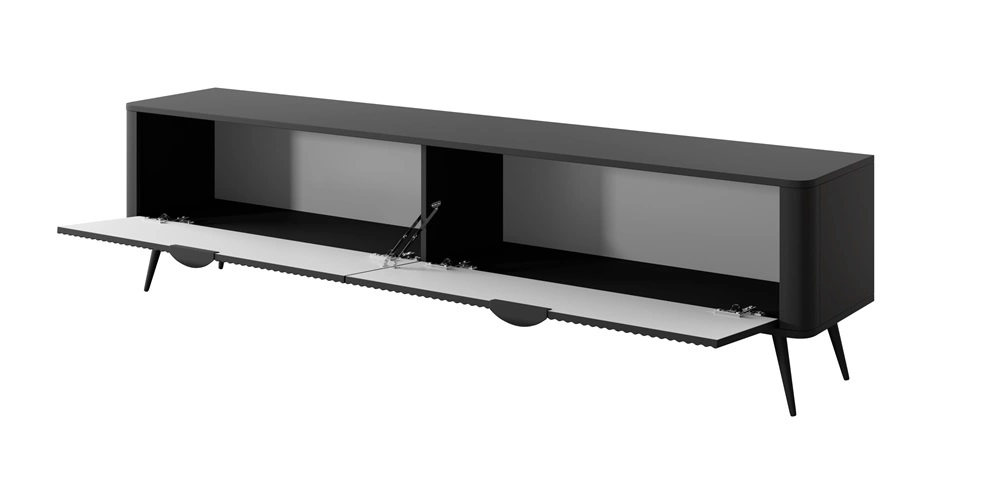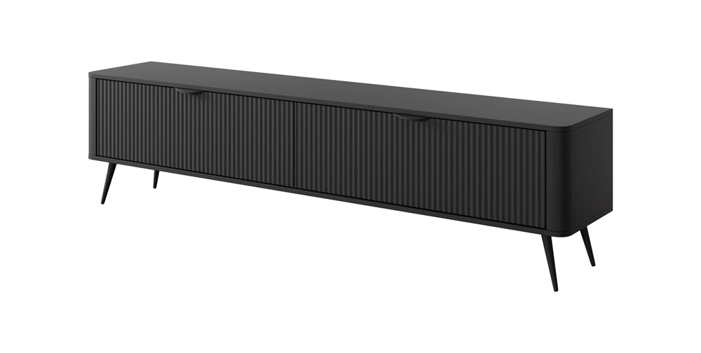 RTV skříň Lante 200 cm černá moderní design korpusu na vysokých nohách rýhované čelo charakteristický oválný tvar