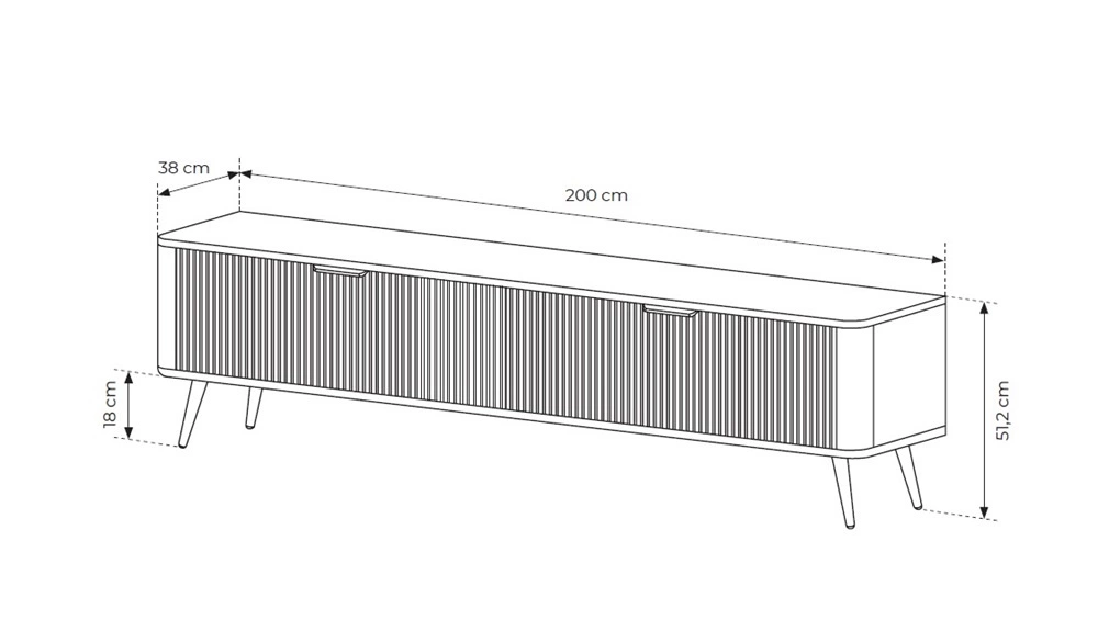 Drážkovaná čela byly vyrobeny z mDF. Tělo skříně RTV je vyrobeno z vysoce kvalitní laminovaná deska o tloušťce 16 mm, který je odolný vůči vnějším vlivům, jako jsou otlaky, nárazy a nešťastné škrábance. Struktura nábytku se měnila pomocí černým kovové nohy. Precizní zpracování a pozornost věnovaná detailům zajistí, že si televizní skříňka zachová svůj krásný vzhled po mnoho let, aniž by ztratila funkčnost.