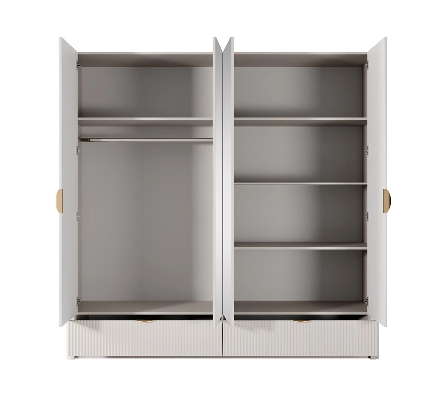Šatní skříň v ložnici Lante je rozdělena na část s tyčí pro zavěšení oděvů i díl s policemi. Drážkovaná čela byly vyrobeny z mDF. Korpus šatní skříně do ložnice je vyroben ze vysoce kvalitní laminovaná deska o tloušťce 16 mm, který je odolný vůči vnějším vlivům, jako jsou otlaky, nárazy a nešťastné škrábance. Dsilná zrcadla na prostředních dveřích šatní skříně, aby se prostor prosvětlil a opticky zvětšil. Precizní zpracování a pozornost věnovaná detailům zajistit, aby si skříň zachovala svůj krásný vzhled po mnoho let, aniž by ztratila funkčnost.