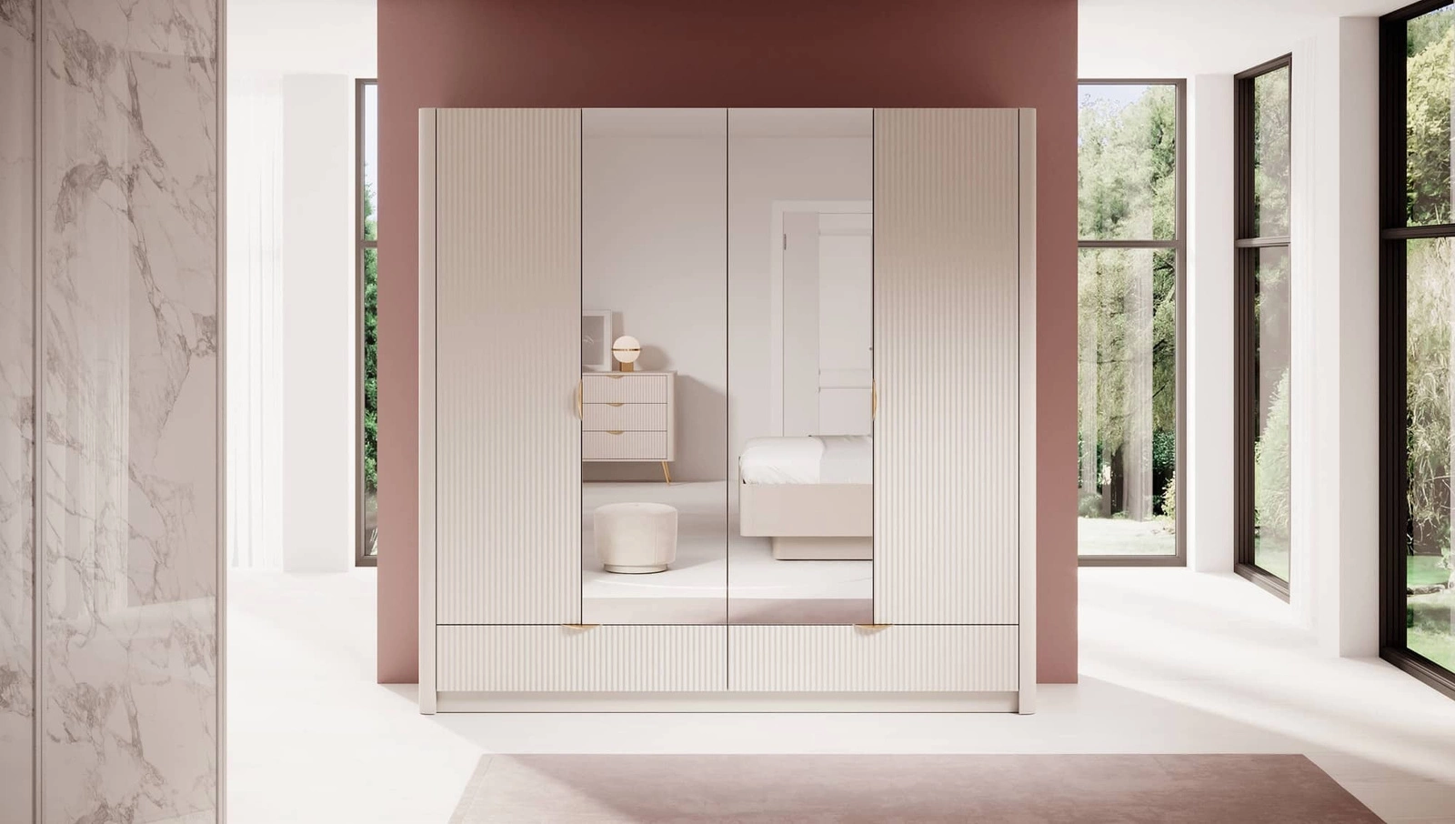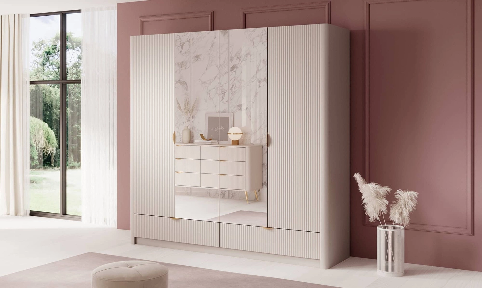 Zrcadlová šatní skříň Lante 213 cm béžová stylová šatní skříň se zásuvkami v moderním designu drážkovaná čela originální zaoblený tvar