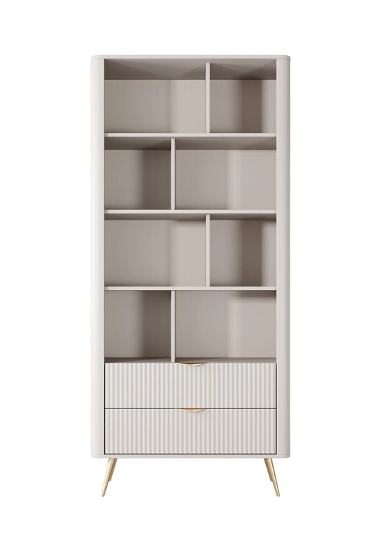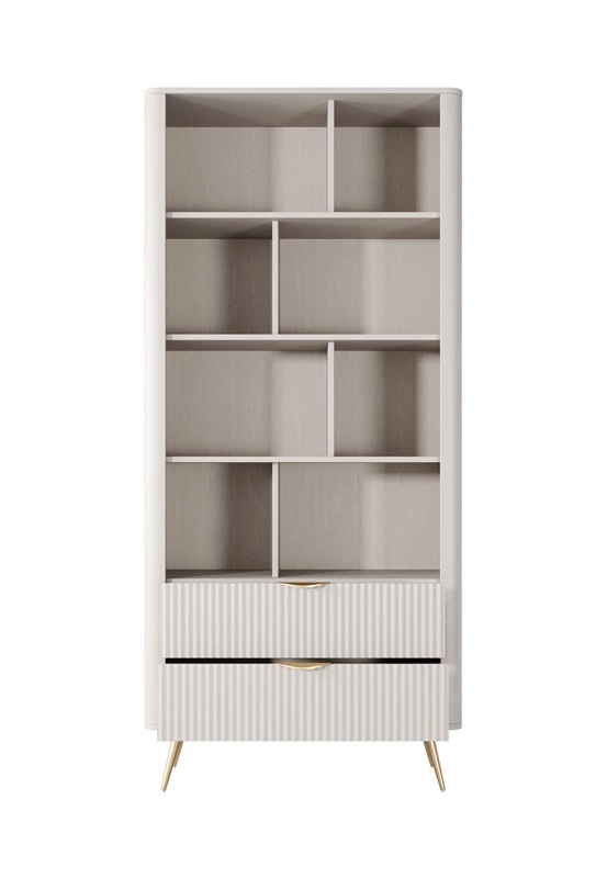 Knihovna Lante 88 cm béžová elegantní knihovna se zásuvkami designové drážkování na čelech kovové zlaté hrany úchytek