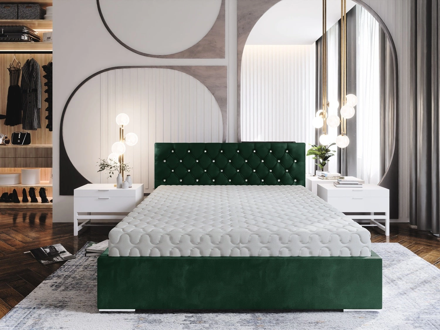 Čalouněná postel Bauru 140x200 lahvově zelená s kontejnerem v moderním skandinávském stylu s prošívaným podhlavníkem s krystaly