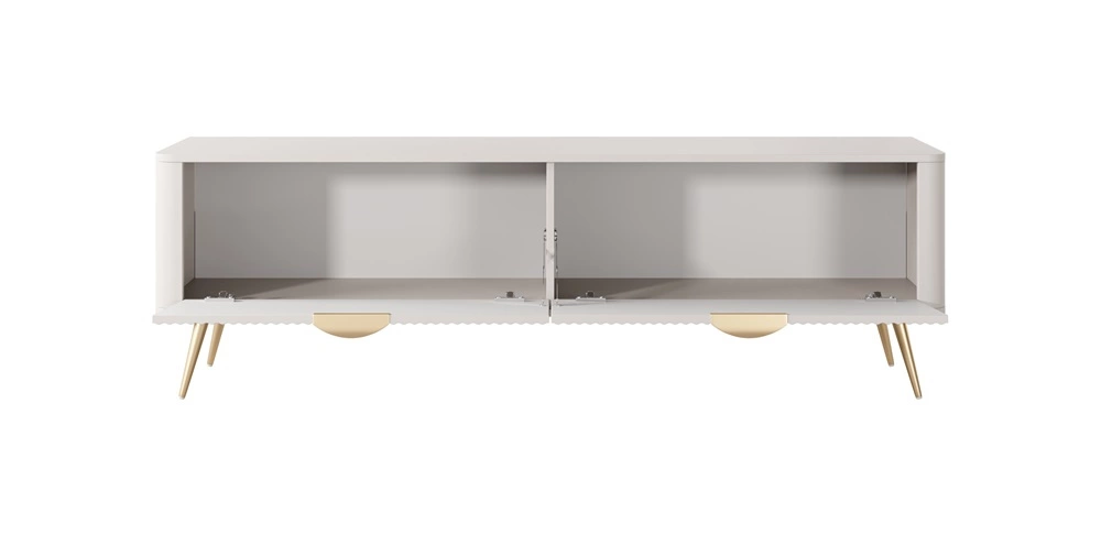 Drážkovaná čela byly vyrobeny z mDF. Tělo skříně RTV je vyrobeno z vysoce kvalitní laminovaná deska o tloušťce 16 mm, který je odolný vůči vnějším vlivům, jako jsou otlaky, nárazy a nešťastné škrábance. Konstrukce nábytku byla zdobena zlatem kovové nohy. Precizní zpracování a pozornost věnovaná detailům zajistí, že si televizní skříňka zachová svůj krásný vzhled po mnoho let, aniž by ztratila funkčnost.