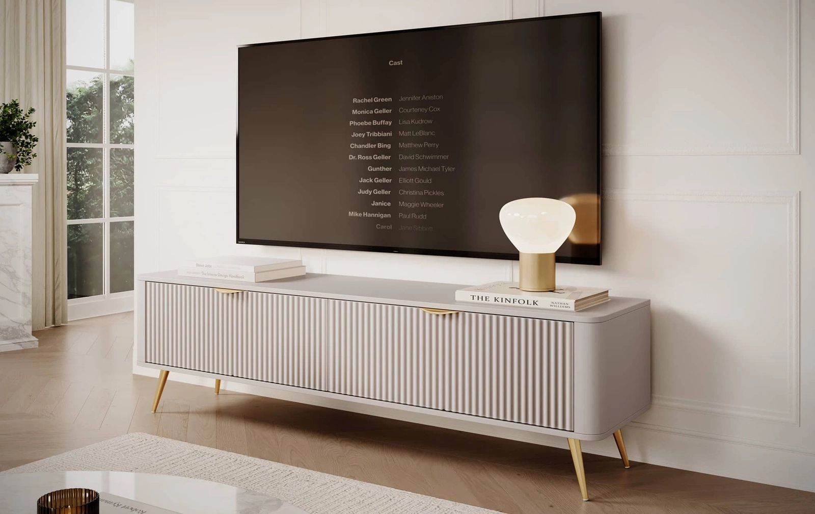 RTV skříňka Lante 163 cm béžová designová TV skříňka v módním stylu zaoblené hrany masivního vkusného drážkovaného čela