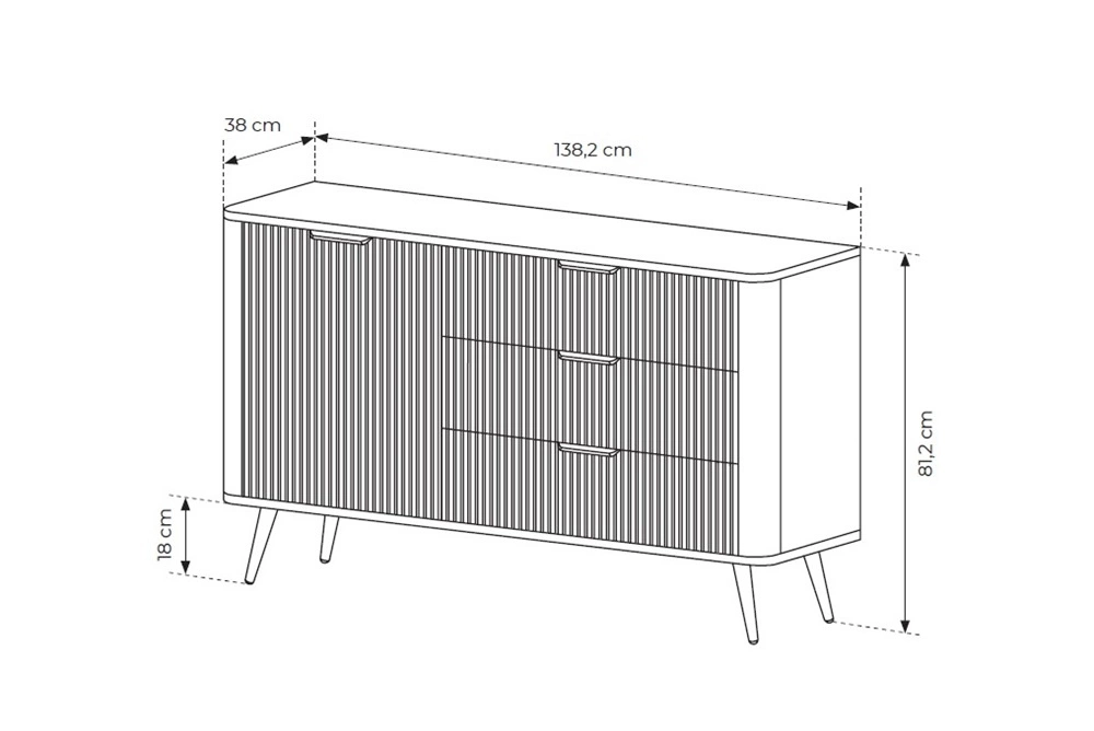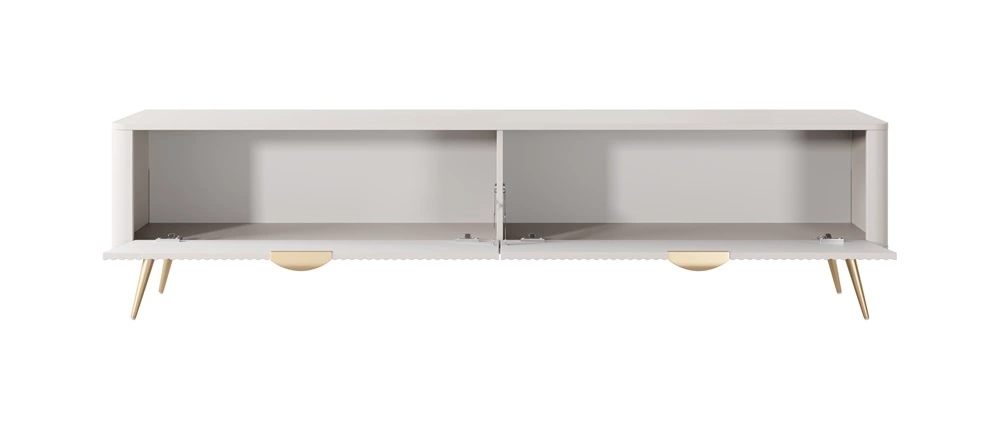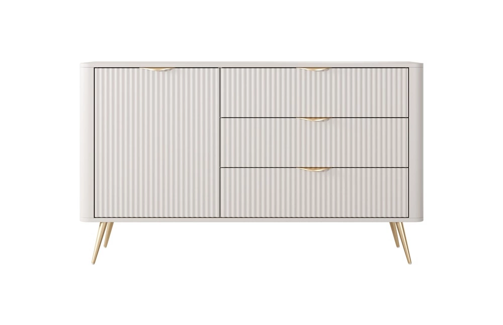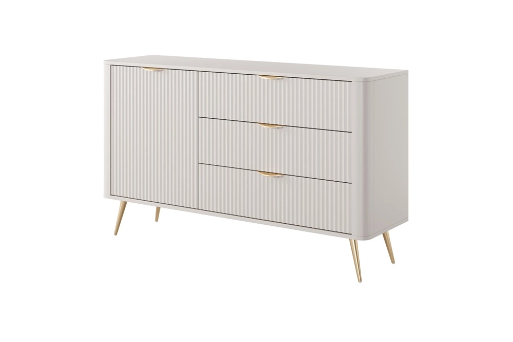 Drážkovaná čela byly vyrobeny z mDF. Nábytkové korpusy jsou vyrobeny z vysoce kvalitní laminovaná deska o tloušťce 16 mm, který je odolný vůči vnějším vlivům, jako jsou otlaky, nárazy a nešťastné škrábance. Design nábytku je rozmanitý a zlatý kovové nohy. Precizní zpracování a pozornost věnovaná detailům zajistí, že si nábytek v obývacím pokoji zachová svůj krásný vzhled po mnoho let, aniž by ztratil funkčnost.