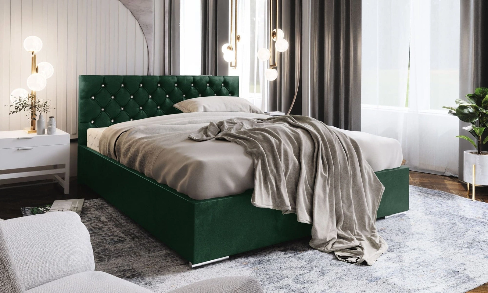 Čalouněná postel Bauru 160x200 lahvově zelená s kontejnerem v moderním skandinávském stylu s prošívaným podhlavníkem s krystaly