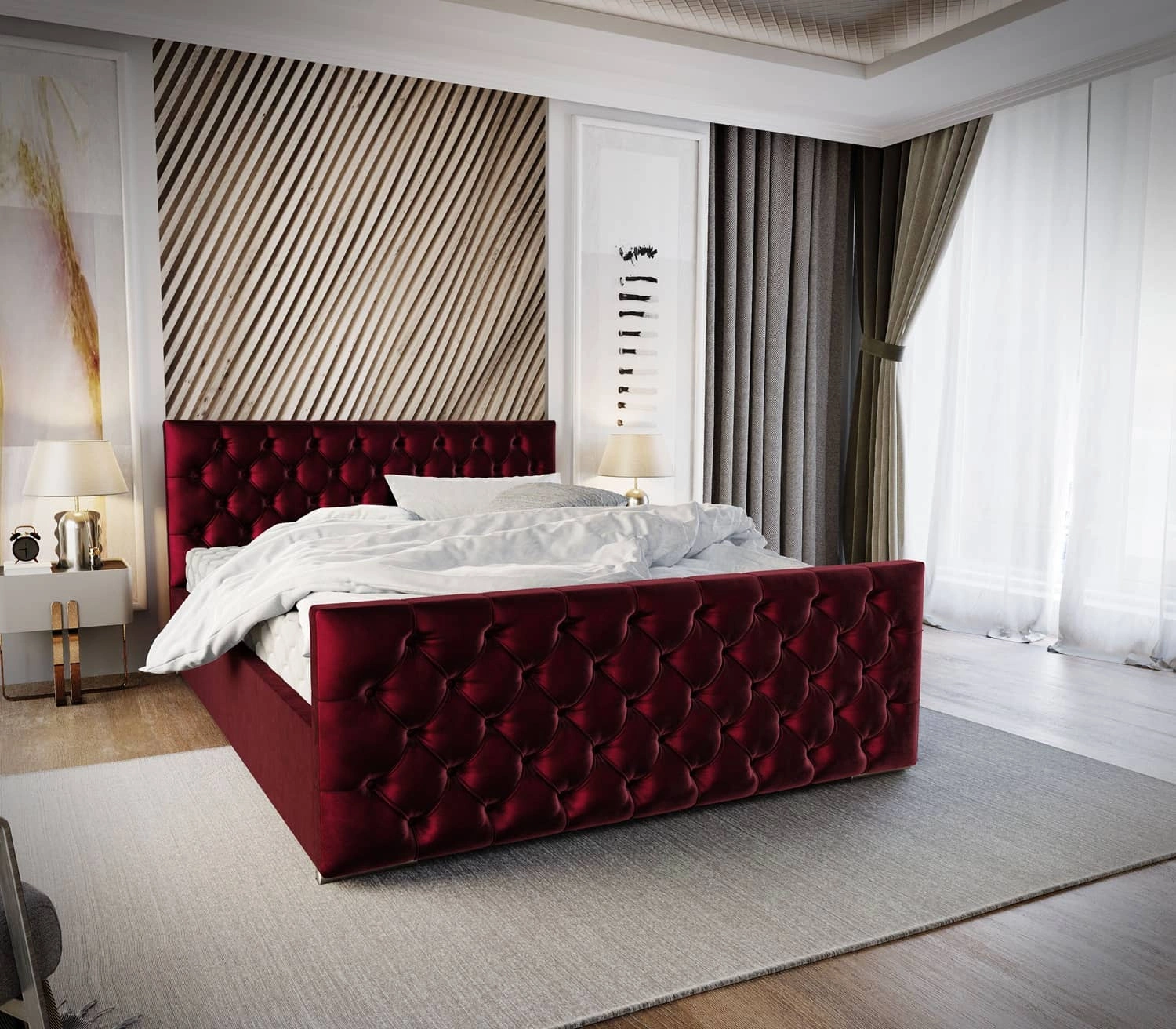 Čalouněná postel Viamao 160x200 ve vínové barvě je ideálním řešením pro ložnice zařízené v moderním, skandinávském i klasickém stylu.