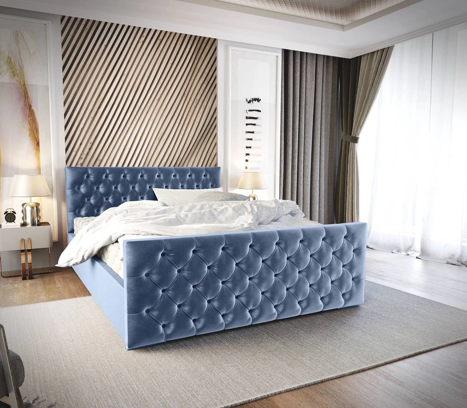 Čalouněná postel Viamao 160x200 modrá s kontejnerem v moderním skandinávském stylu s prošívaným čelem a nohou