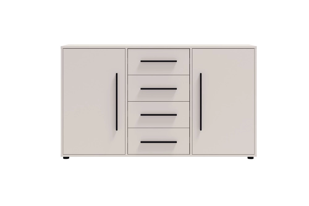 Komoda je vyrobena ze 4 zásuvky a 2 dveře. Komoda zaručuje pohodlné a bezproblémové používání a trvanlivost celého nábytku po mnoho let používání. Béžová barva v kašmírovém odstínu dodává místnosti lehký a útulný pocit, díky čemuž se komoda Maxione skvěle hodí jako komoda do obývacího pokoje s originálním designem povrchovou úpravou, komody do obývacího pokoje nebo komody do ložnice v moderním stylu. Komodu lze s úspěchem použít i jako kancelářský nábytek.
