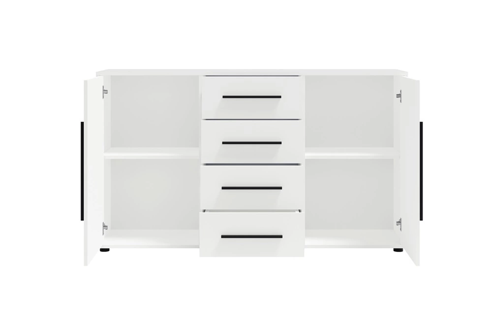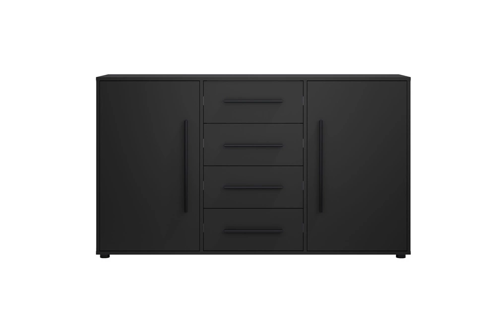 Komoda je vyrobena ze 4 zásuvky a 2 dveře. Komoda zaručuje pohodlné a bezproblémové používání a trvanlivost celého nábytku po mnoho let používání. Klasická černá dodává místnosti eleganci a zvláštní nádech, díky čemuž se komoda Maxione skvěle hodí jako komoda do obývacího pokoje s originálním designem povrchovou úpravou, komody do obývacího pokoje nebo komody do ložnice v moderním stylu. Komodu lze s úspěchem použít i jako kancelářský nábytek.