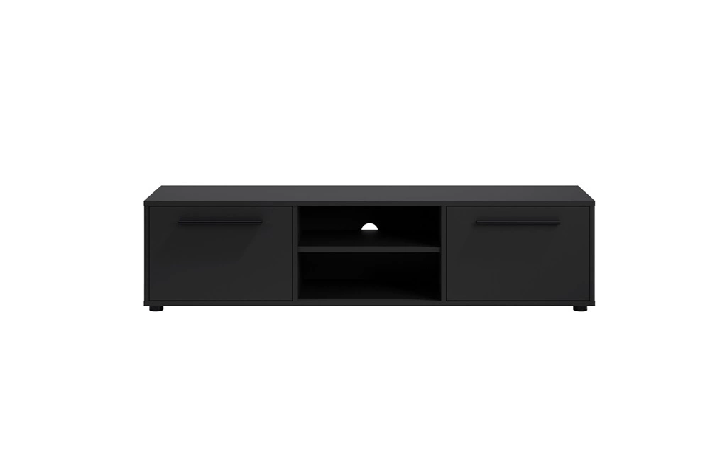 Skříňka RTV Maxione 150 cm v černé barvě je dokonalým doplňkem každého obývacího pokoje nebo zasedací místnosti.
