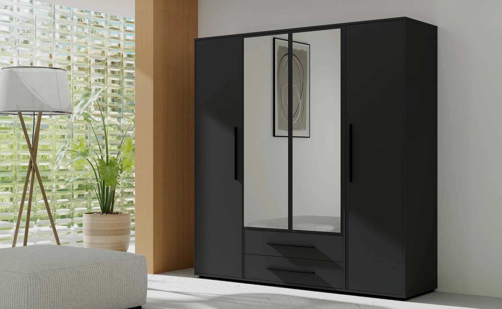 Zrcadlová skříňka je vyrobena ze 4 dvířka a 2 zásuvky. Šatní skříň v ložnici zaručuje pohodlné a bezproblémové používání a trvanlivost celého nábytku po mnoho let používání. Klasická černá barva dodává místnosti eleganci a zvláštní nádech, skříň lze úspěšně použít jako zrcadlová šatní skříň do ložnice, jako šatní skříň do předsíně nebo jako šatní skříň do dětského pokoje dětský pokoj. Šatní skříň Maxione bude také skvělá volba pro pokoj pro mládež. Skvěle se hodí i jako šatní skříň do předsíně.