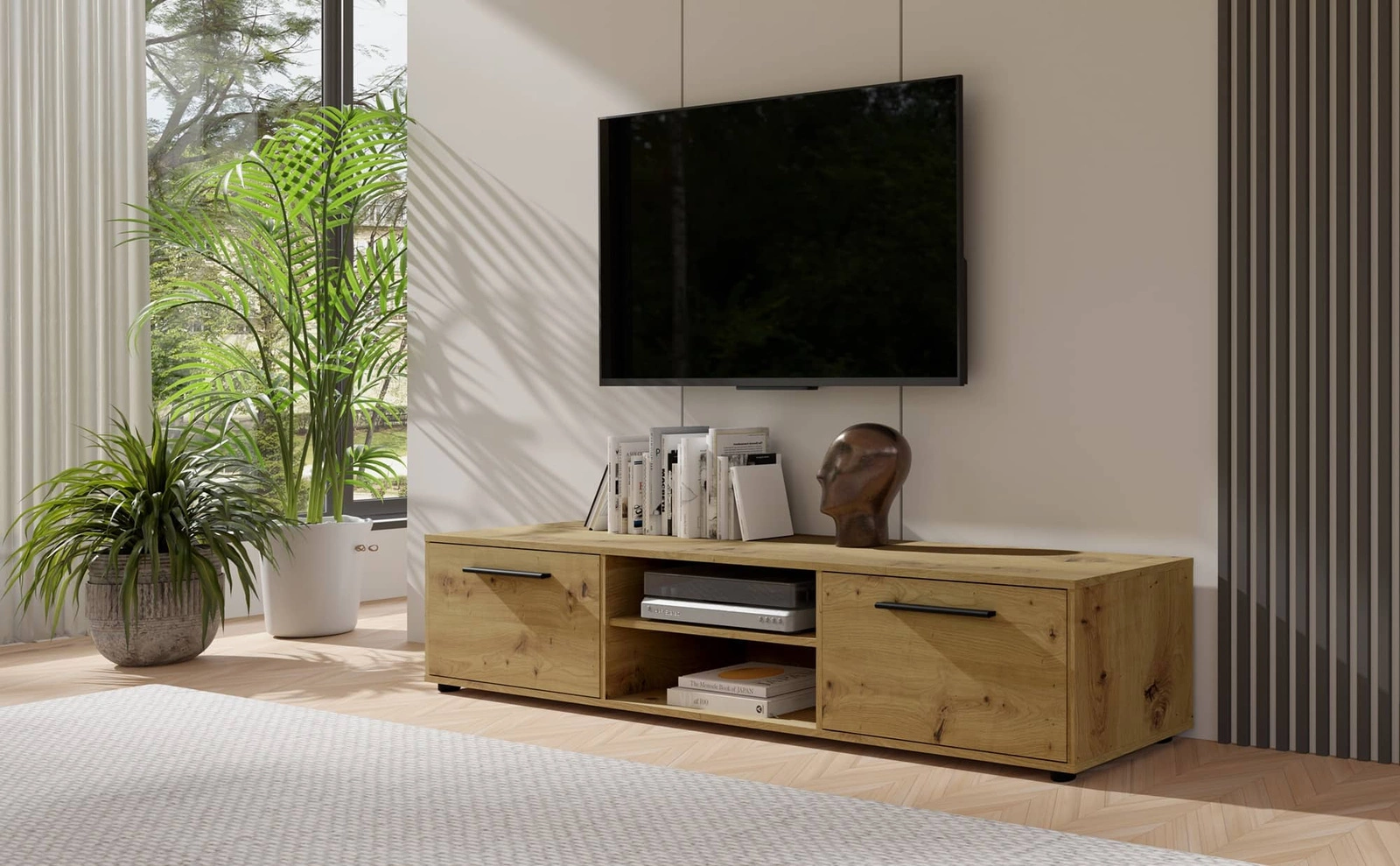 Skříňka RTV Maxione 190 cm v provedení dub artisan je dokonalým doplňkem každého obývacího pokoje nebo zasedací místnosti.