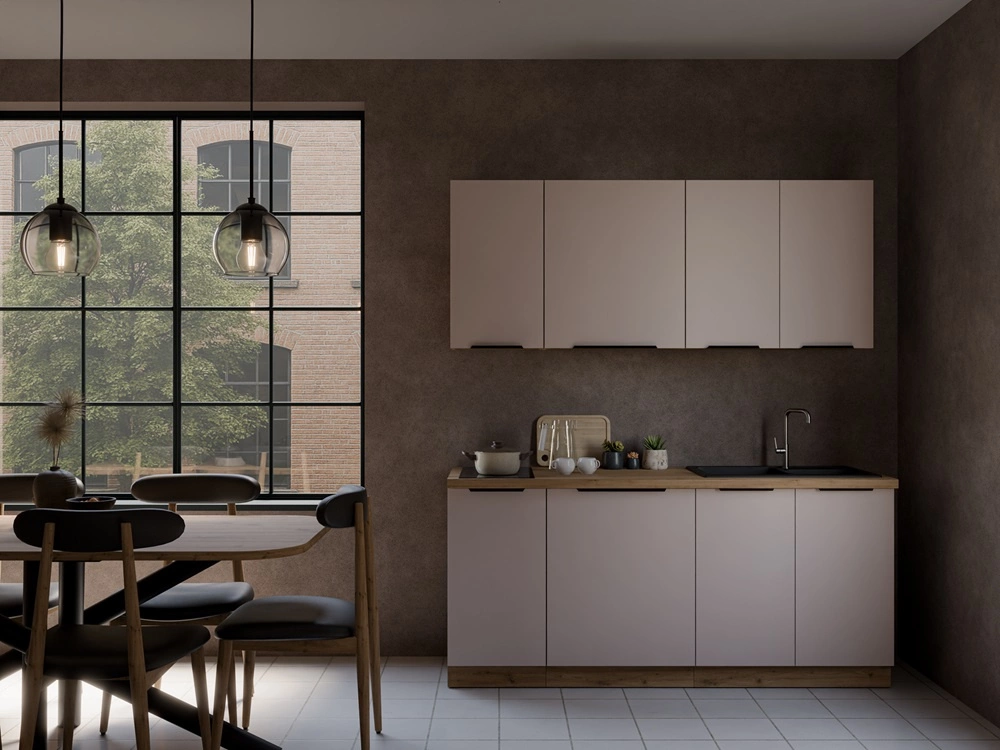 Sada kuchyňského nábytku Soela 180 cm elegantní kuchyňské skříňky v jemných a přírodních barvách úchyty s kovovými hranami