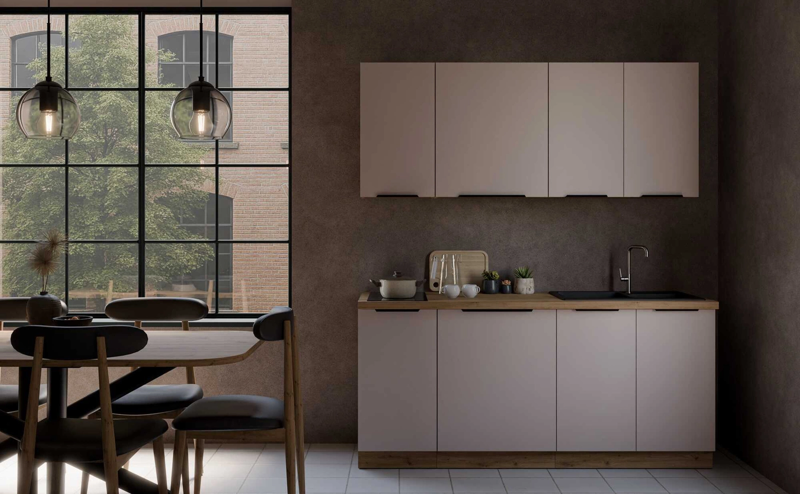 Korpusy a čela kuchyňských skříněk byly vyrobeny z vysoce kvalitní laminovaná deska o tloušťce 16 mm. Výhodou tohoto typu materiálu je vysoká odolnost vnějším vlivům, jako je pára, teplo, vlhkost, rozlité kapaliny. Použitý materiál je také odolný na adrese náhodné poškození. Stylovým doplňkem čel kuchyňských skříněk jsou černá, kovové okrajové držáky, které kromě své primární funkce také podtrhují moderní design skříní.