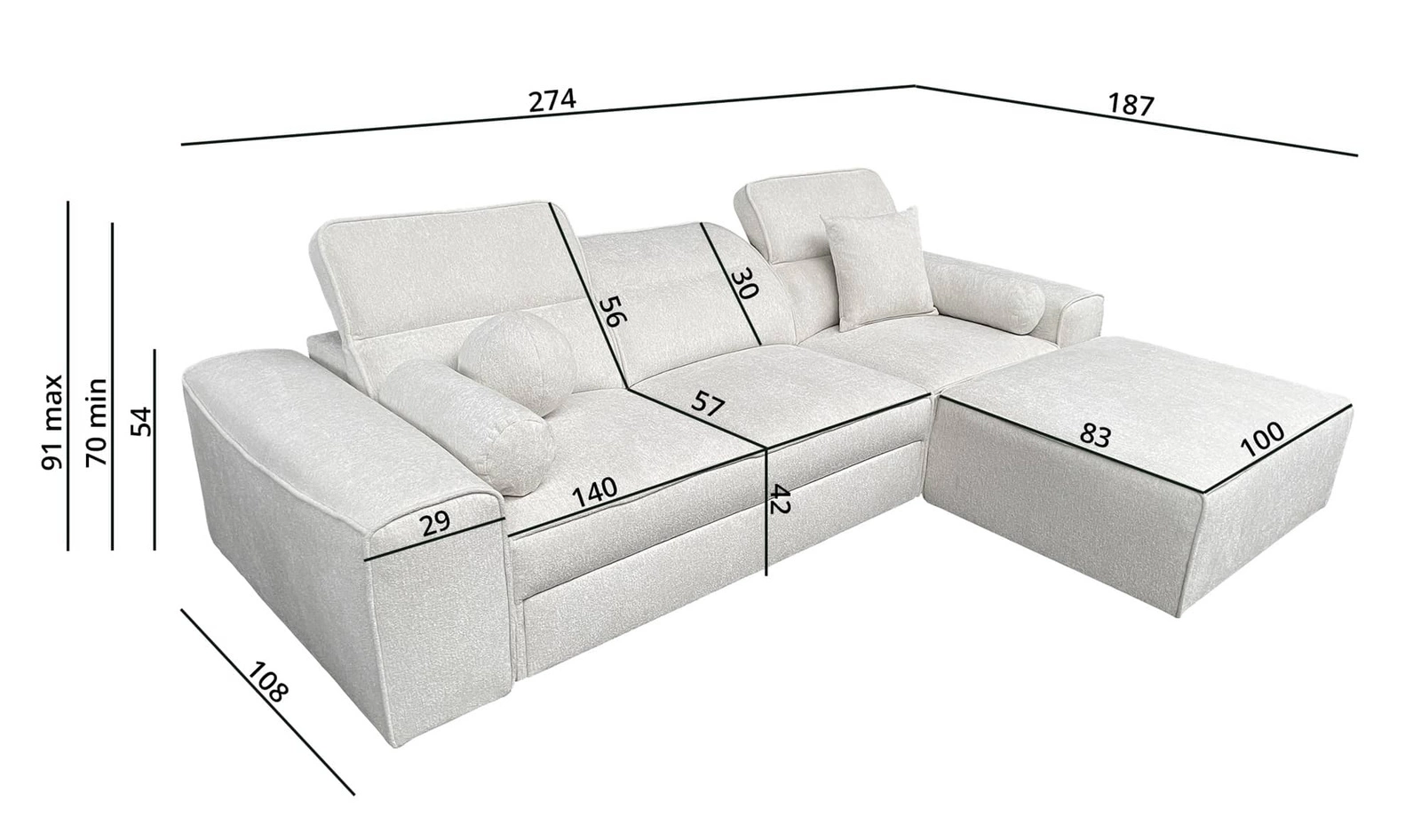 Rozměry nábytku umožňují plánování prostoru v menším obývacím pokoji. Šířka rohu 274 cm, výška 91 cm a hloubka 187 cm. Spací plocha rohové jednotky je 127x210 cm. Výška sedadla nábytku je 42 cm a výška opěradla je 56 cm. Vlnité pružiny a polyuretanová pěna T30 je materiál, z něhož je vyrobeno sedadlo rohu. Pevné opěradlo s nastavitelnými opěrkami hlavy umožní snadné adaptace úhel opěrek hlavy podle vašich preferencí a zaručí vám pohodlný odpočinek po dlouhém dni, který oceníte vy, vaši blízcí i hosté, kteří si na tuto jedinečnou rohovou pohovku sednou.