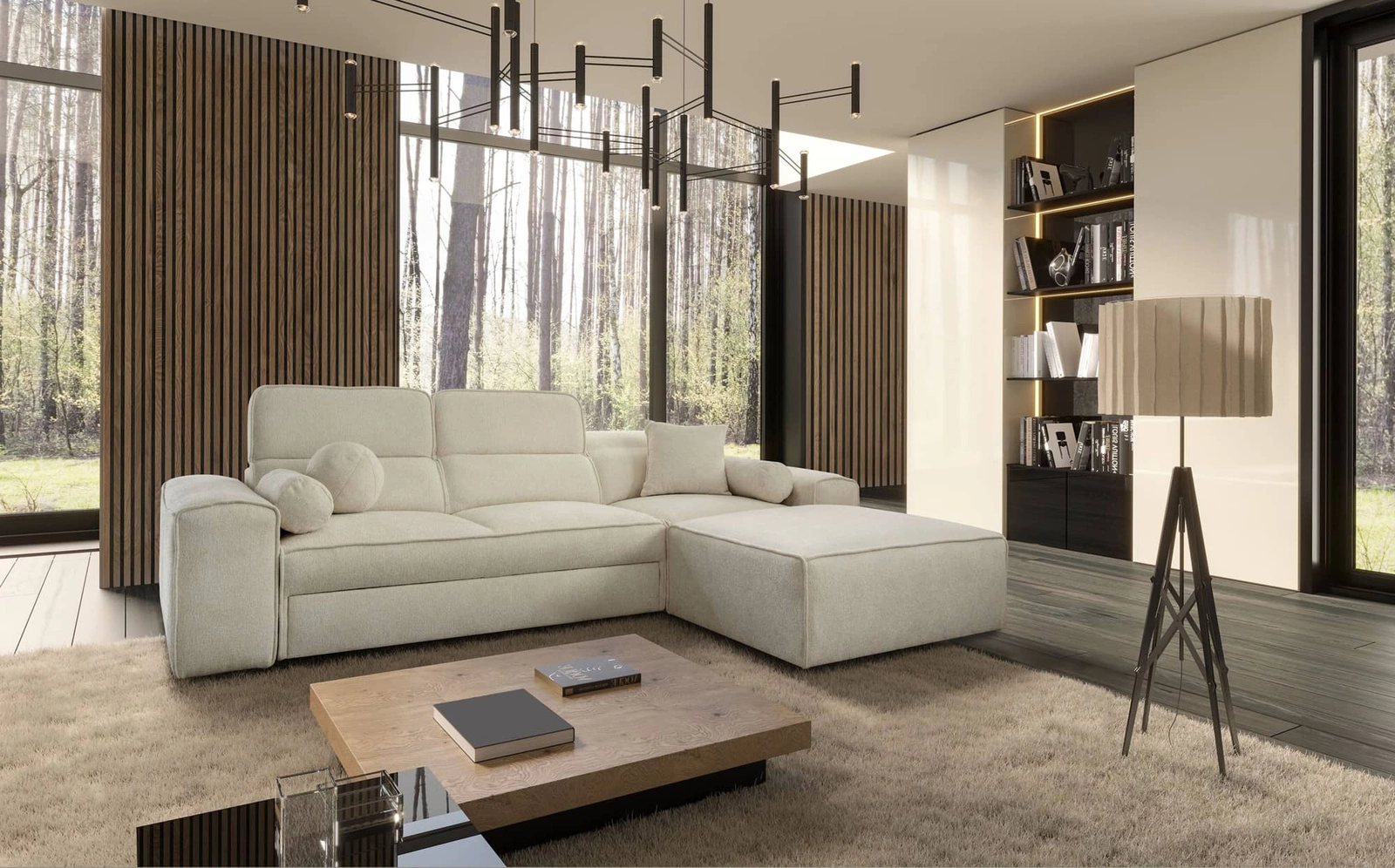 Rohová sedací souprava s funkcí spaní Viano krémová pravá strana Stylová rohová sedací souprava zajímavého tvaru s nastavitelnými opěrkami hlavy Dekorativní polštáře