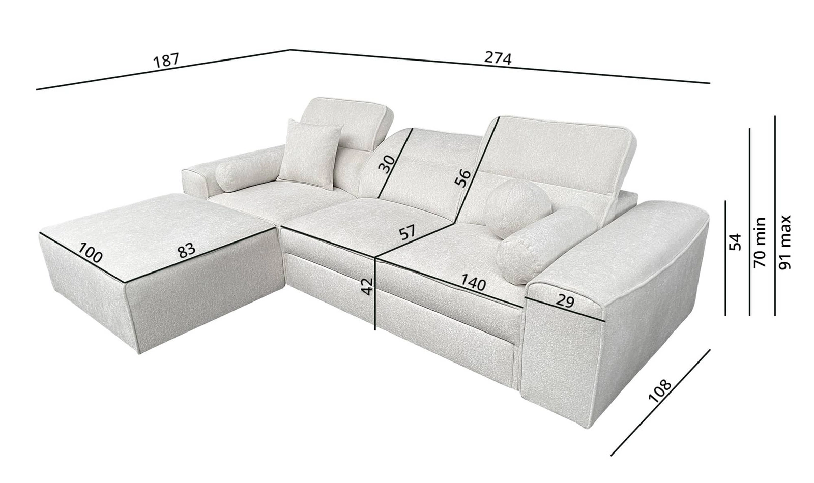 Rozměry nábytku umožňují plánování prostoru v menším obývacím pokoji. Šířka rohu 274 cm, výška 91 cm a hloubka 187 cm. Spací plocha rohové jednotky je 127x210 cm. Výška sedadla nábytku je 42 cm a výška opěradla je 56 cm. Vlnité pružiny a polyuretanová pěna T30 je materiál, z něhož je vyrobeno sedadlo rohu. Pevné opěradlo s nastavitelnými opěrkami hlavy umožní snadné adaptace úhel opěrek hlavy podle vašich preferencí a zaručí vám pohodlný odpočinek po dlouhém dni, který oceníte vy, vaši blízcí i hosté, kteří si na tuto jedinečnou rohovou pohovku sednou.