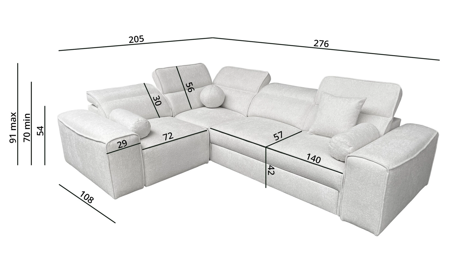 Rozměry nábytku umožňují plánování prostoru v menším obývacím pokoji. Šířka rohu 276 cm, výška 91 cm a hloubka 205 cm. Spací plocha rohové jednotky je 127x198 cm. Výška sedadla nábytku je 42 cm a výška opěradla je 56 cm. Vlnité pružiny a polyuretanová pěna T30 je materiál, z něhož je vyrobeno sedadlo rohu. Pevné opěradlo s nastavitelnými opěrkami hlavy umožní snadné adaptace úhel opěrek hlavy podle vašich preferencí a zaručí vám pohodlný odpočinek po dlouhém dni, který oceníte vy, vaši blízcí i hosté, kteří si na tuto jedinečnou rohovou pohovku sednou.