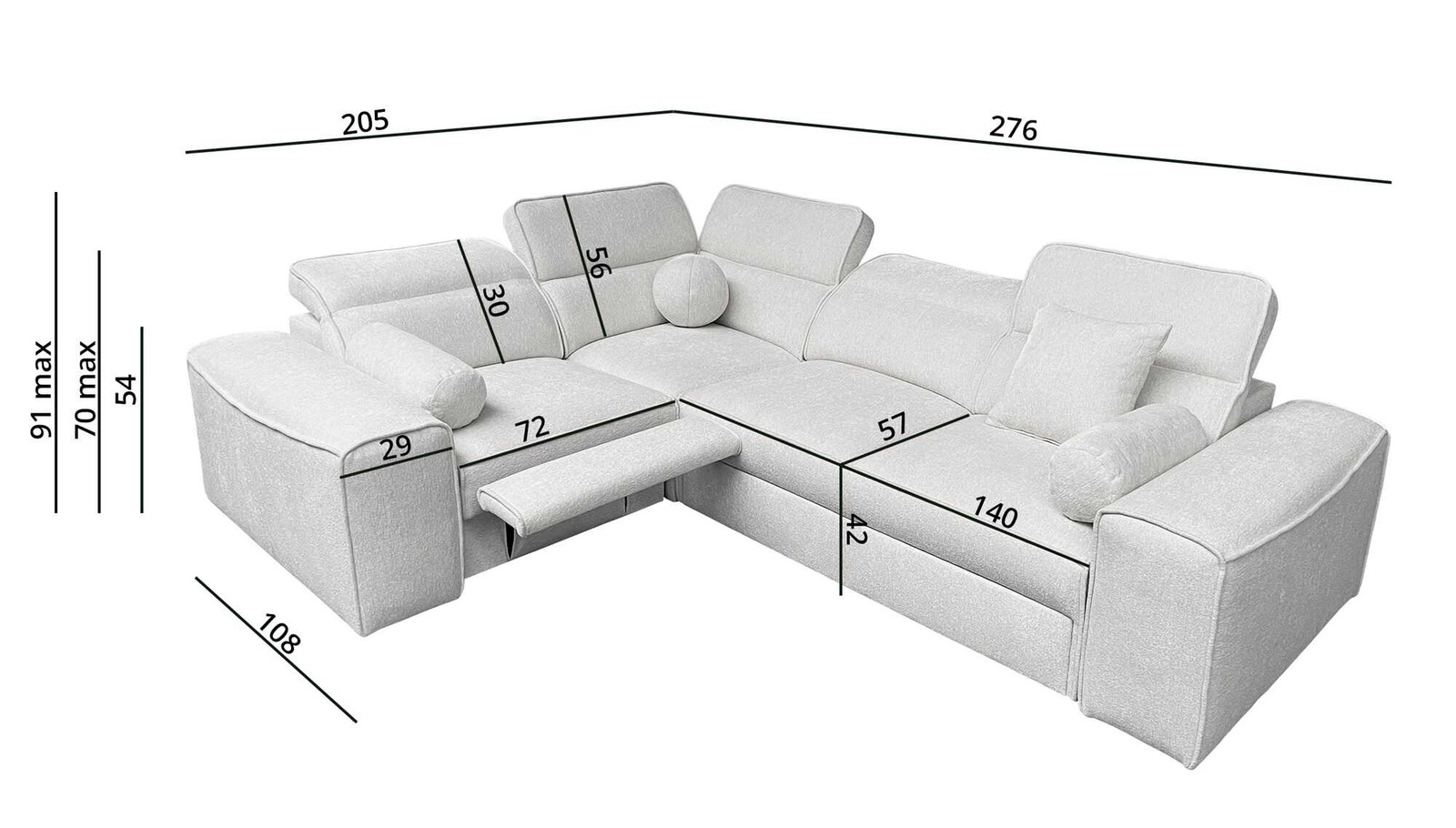 Rozměry nábytku umožňují plánování prostoru v menším obývacím pokoji. Šířka rohu 276 cm, výška 91 cm a hloubka 205 cm. Spací plocha rohové jednotky je 127x198 cm. Výška sedadla nábytku je 42 cm a výška opěradla je 56 cm. Vlnité pružiny a polyuretanová pěna T30 je materiál, z něhož je vyrobeno sedadlo rohu. Pevné opěradlo s nastavitelnými opěrkami hlavy umožní snadné adaptace úhel opěrek hlavy podle vašich preferencí a zaručí vám pohodlný odpočinek po dlouhém dni, který oceníte vy, vaši blízcí i hosté, kteří si na tuto jedinečnou rohovou pohovku sednou.